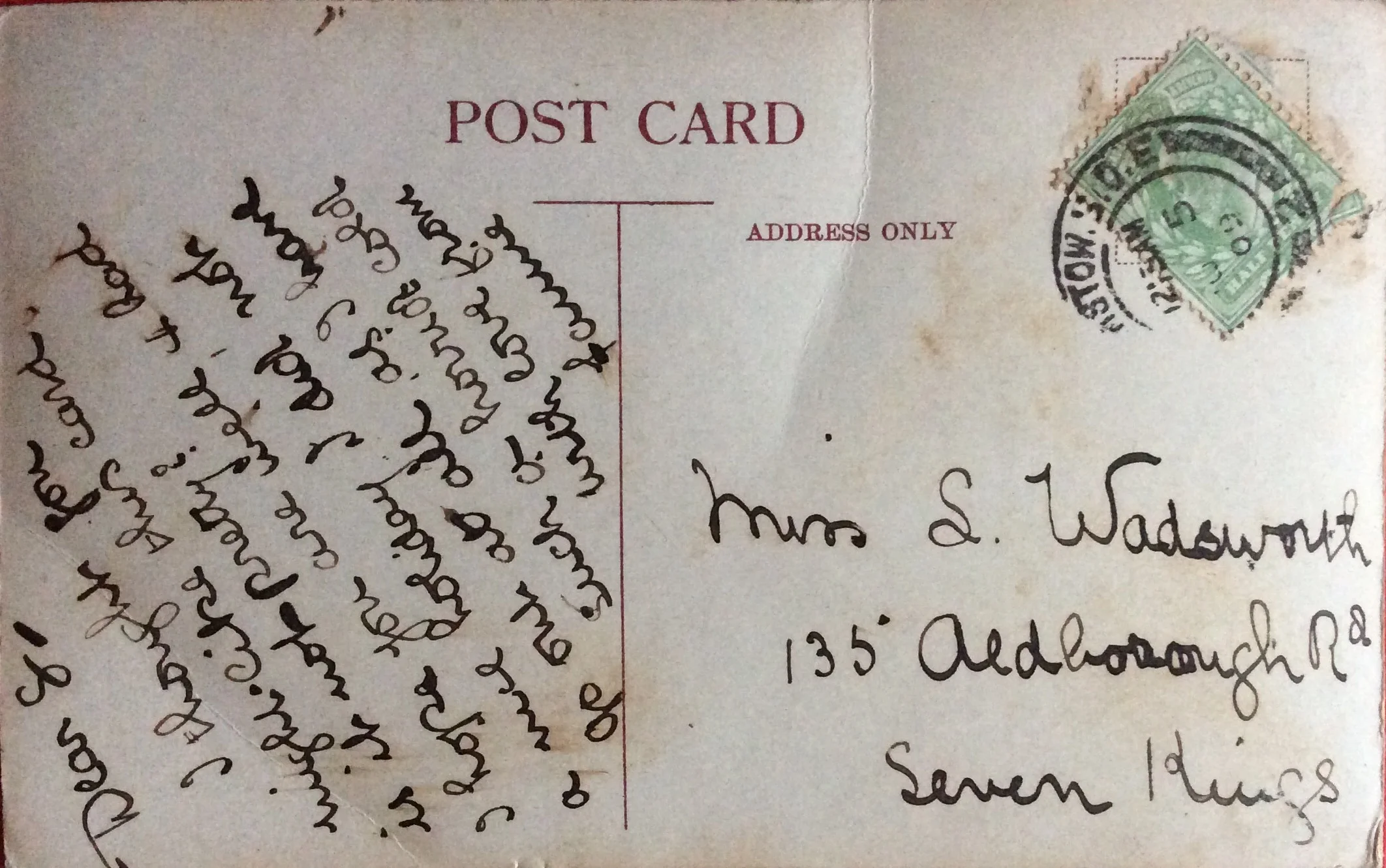 The added significance is that is another card posted from this address in 1908, Mary McCarthy makes reference to "the girl" who has gone to Southend. Perhaps that girl was S Wadsworth.