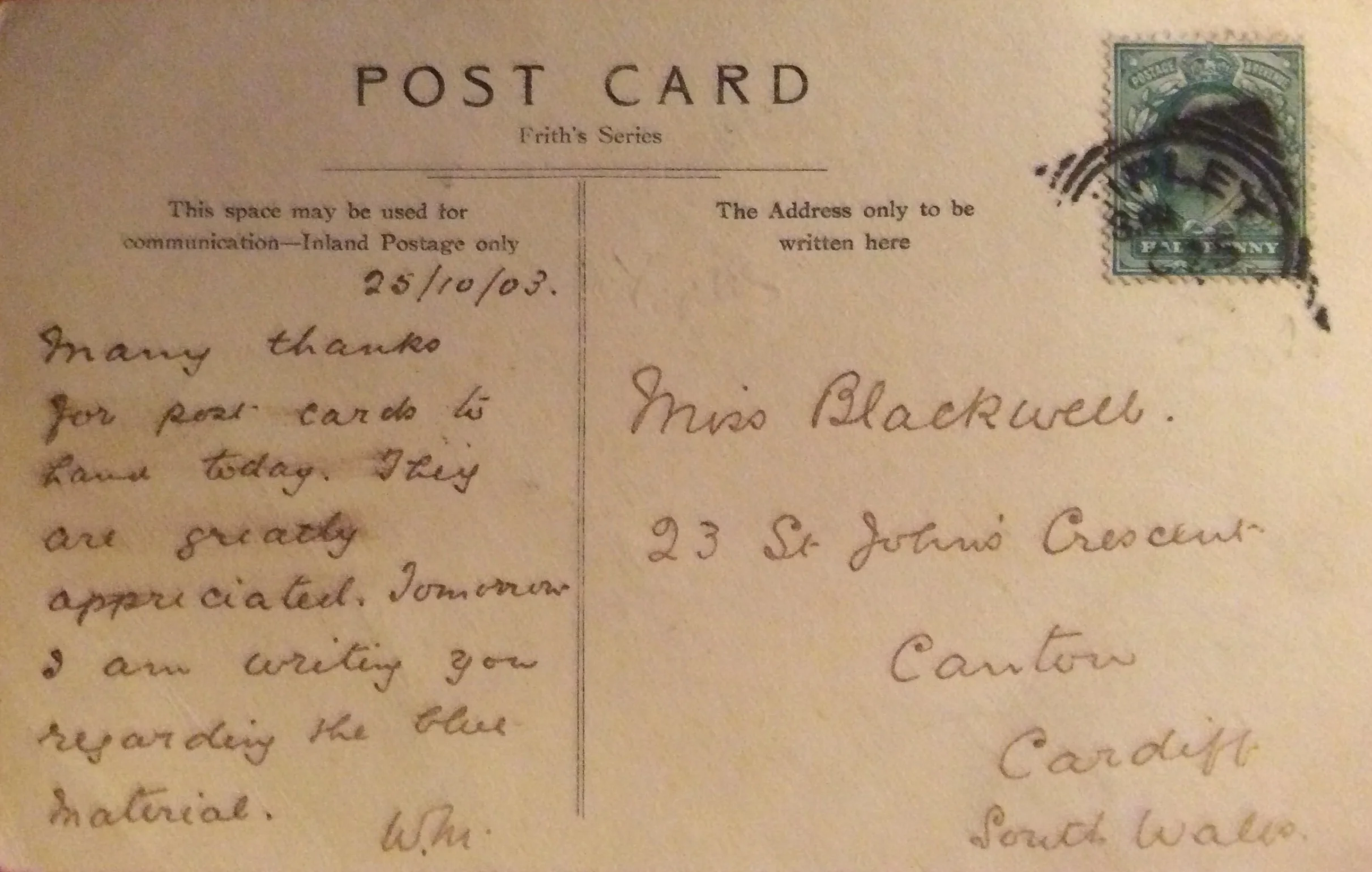 Walter was in the garment trade, both running a business and being a commercial traveller. In 1904, a year after this card was sent, Walter married the recipient Arabella Mabel Blackwell. Although the card is not signed, all the evidence suggests Walter is the writer.