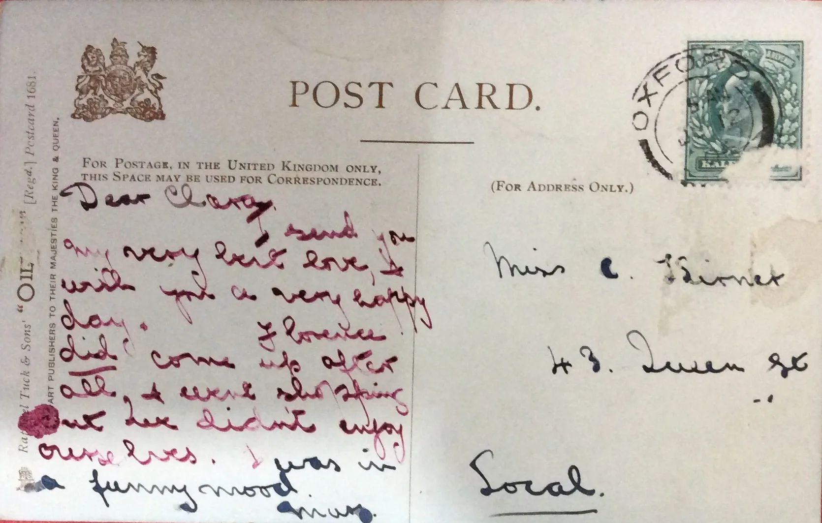 The recipient is Anna Clara Kirner (1892-1970). She was the middle of three daughters of Anthony Kirner (1855-1947) and Maria Rohrer (1859-1927). Anthony was born in Germany and had moved to Oxford by 1881. In 1911 his occupation is recorded as watch repairer. Maria was born in Plymouth. They married in 1886. Clara was still living with her parents in 1911 and was a dressmaker. In 1932, aged 40 she married Albert Joseph Butler (1885-1978) who in 1911 worked as a Postal Telegraph clerk. They did not have any children.