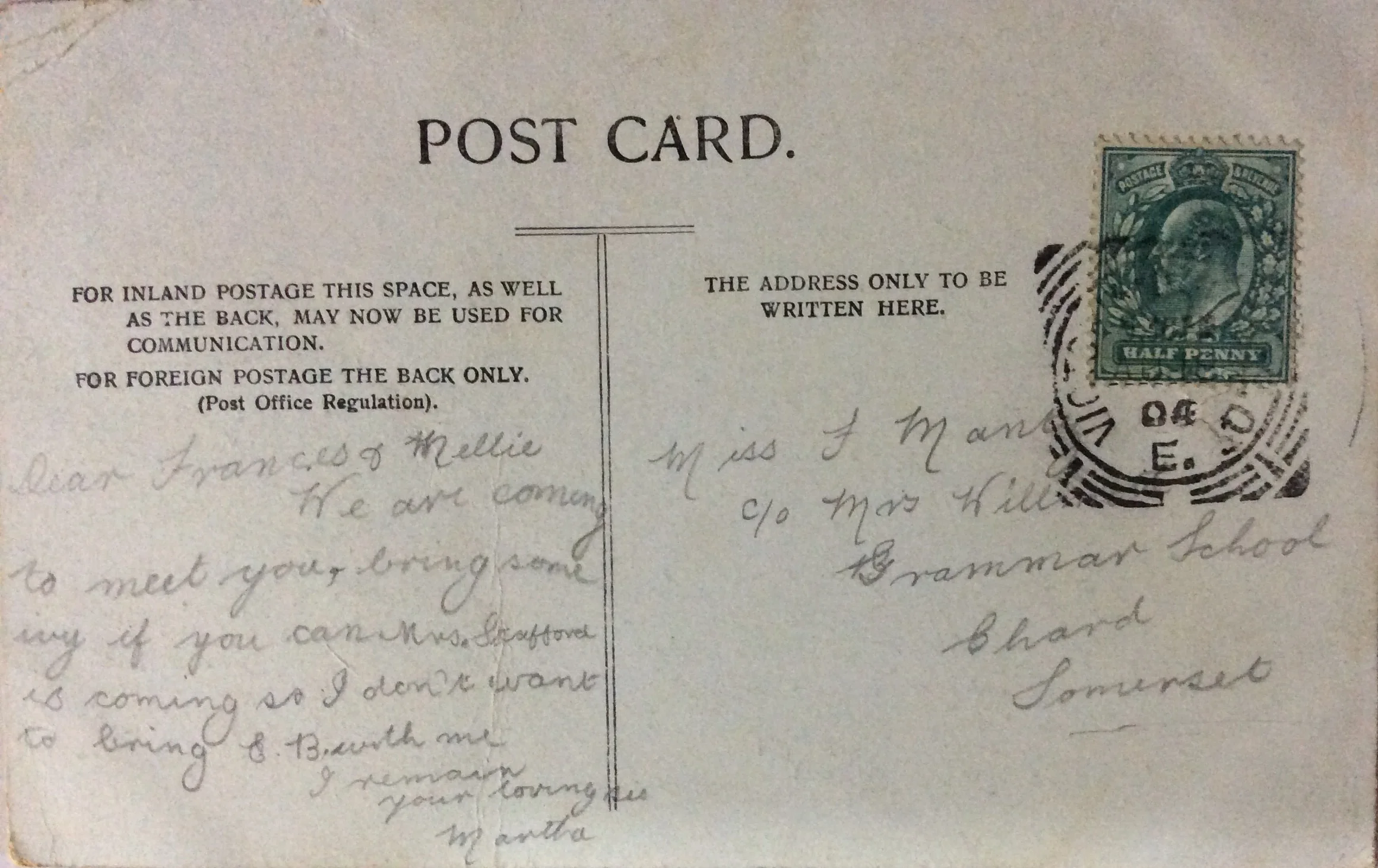 This is the earliest of 12 cards sent by or to Frances Martha Mantz. It is 1904 and she is 17. The card is from her 15 year old younger sister, Martha. The address is a school in Chard, Somerset which in 1904 was a public boarding school. Was Frances a pupil? It is a long way from Victoria Docks. And where were they going to meet?