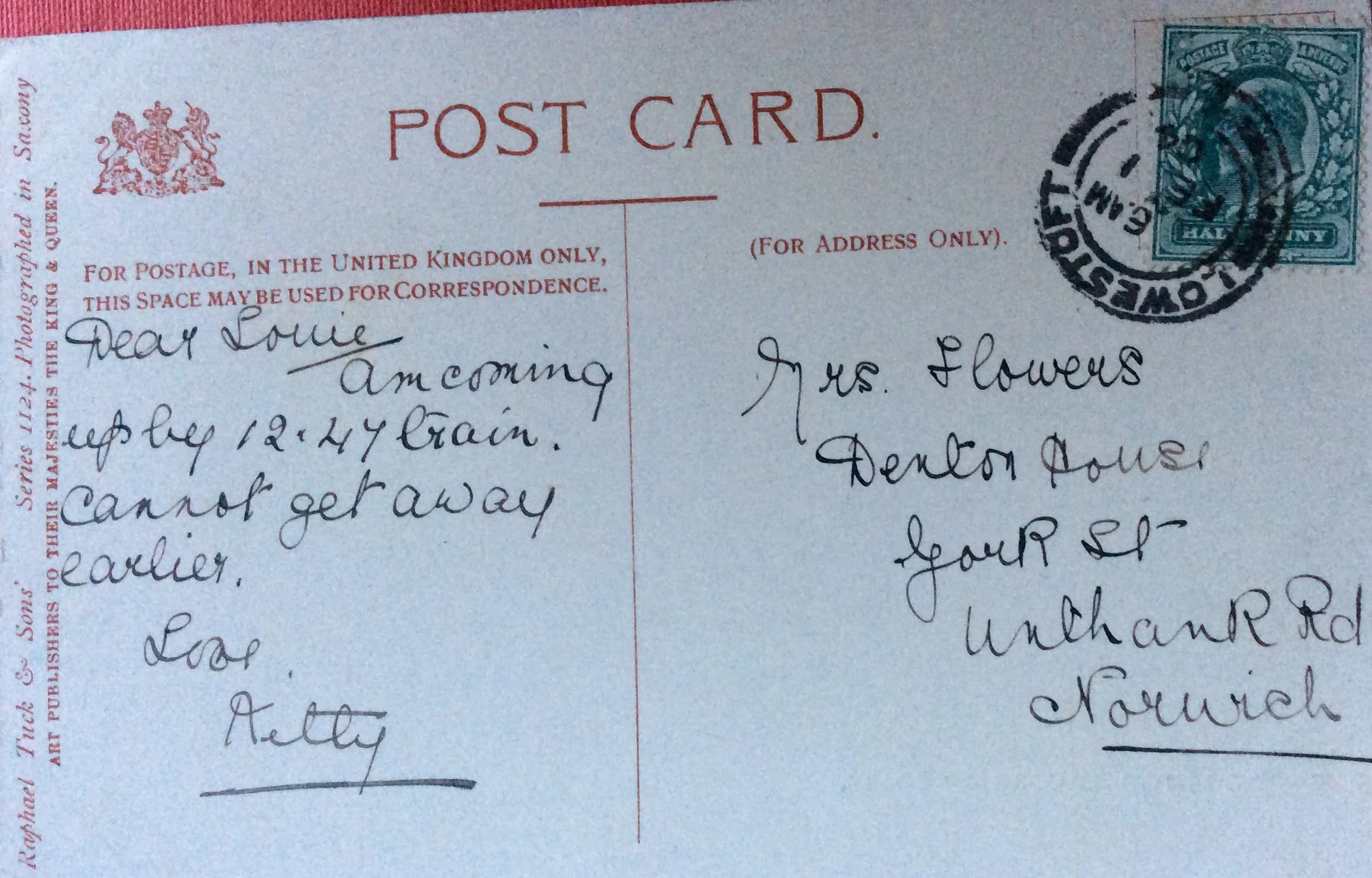 This is the second of two cards sent from Kitty to Louise. Unlike the first, this one does have a message and it is basically a text. The card is stamped at 6.00 am and refers to a train journey being taken about 6 hours later. The card is therefore expected to travel the 12 miles in much less time than that. Still no idea who Kitty is. I wonder why she couldn't get away. And what from?
