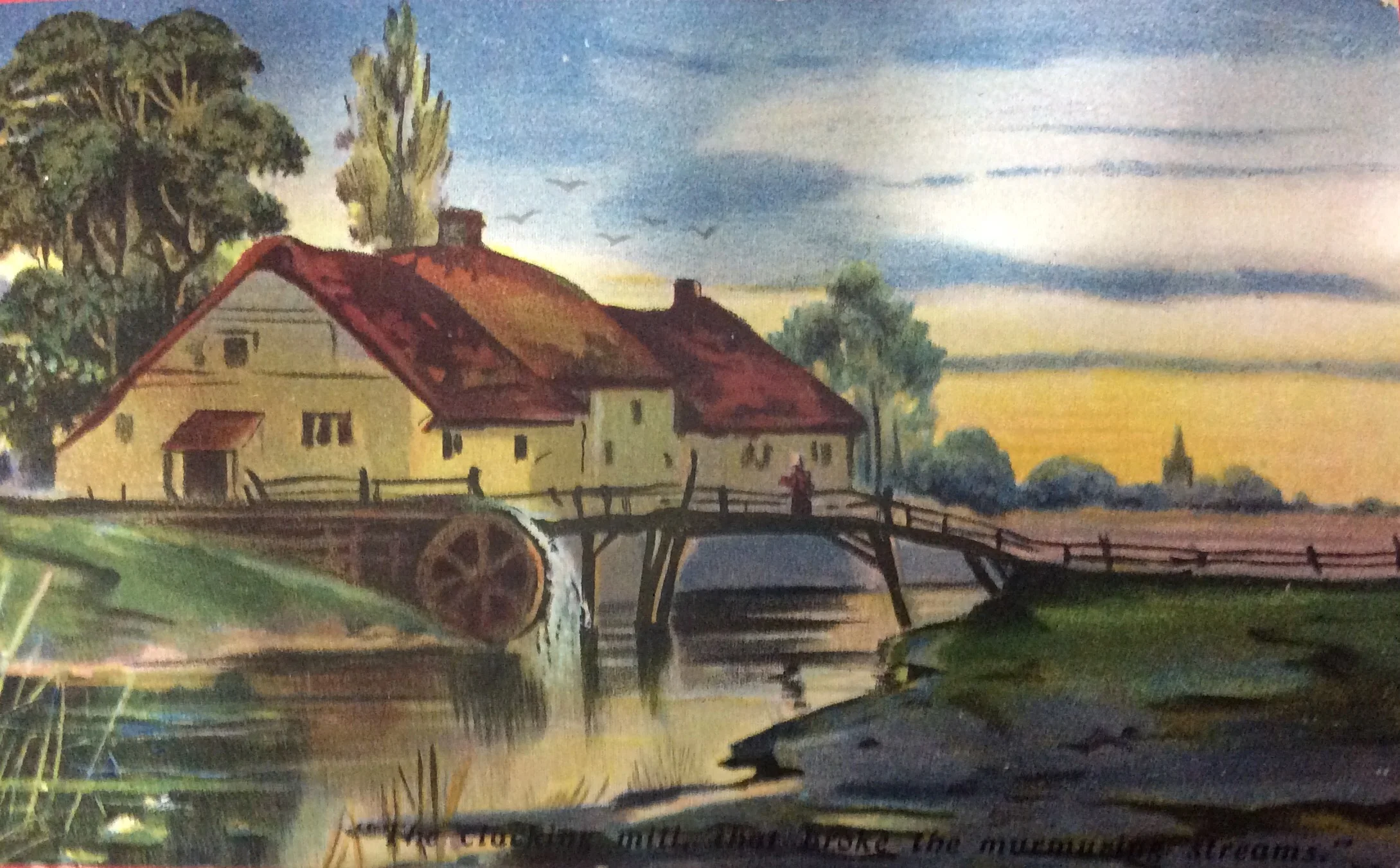 The picture on the card shows a painting of a water mill and has a quote from William Wordsworth (https://en.wikipedia.org/wiki/William_Wordsworth) which reads "the clacking mill that broke the murmuring streams". It is not the only postcard that carries this quote.