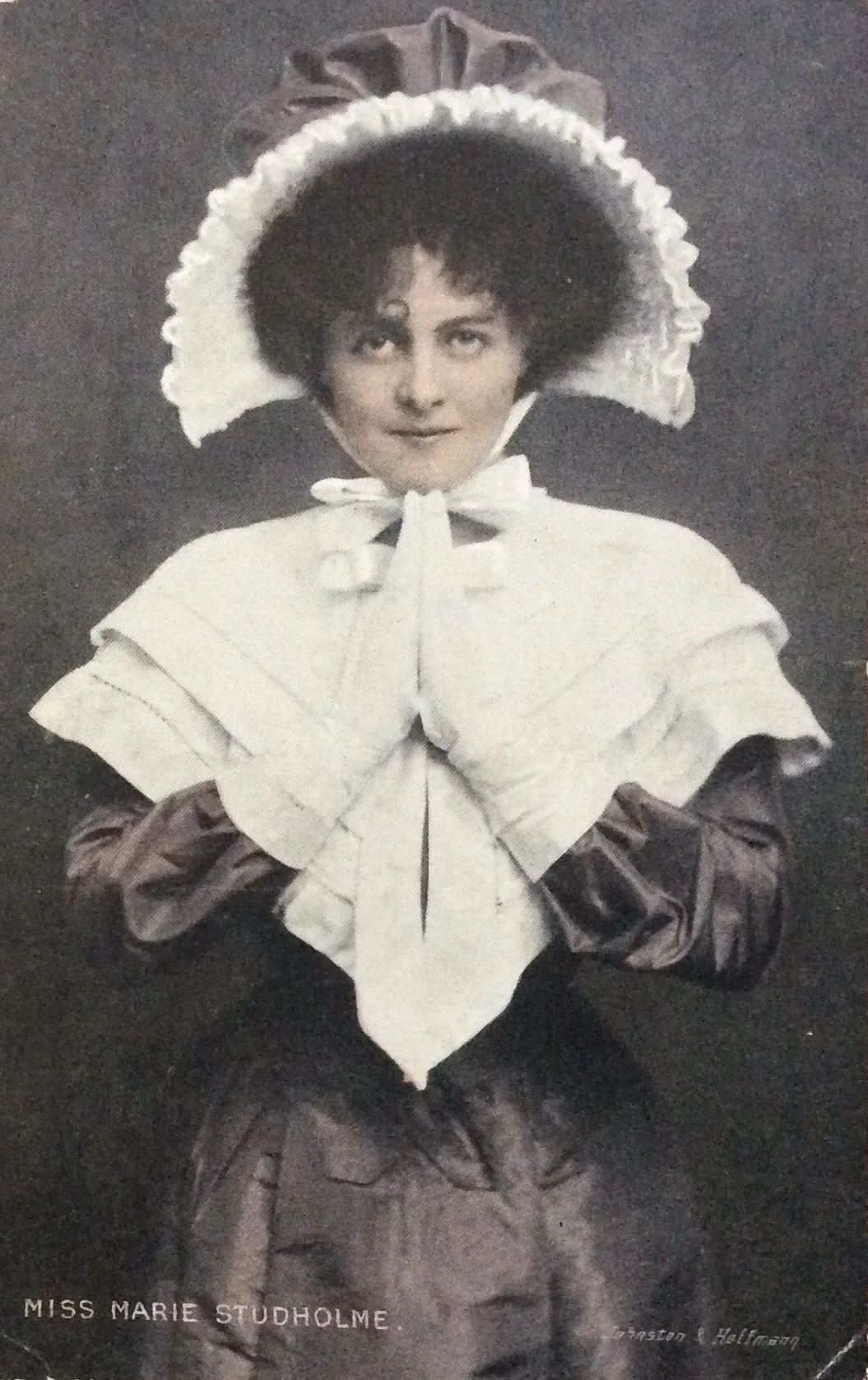 The picture shows the actress and music hall star Marie Studholme (https://en.wikipedia.org/wiki/Marie_Studholme) and this is referred to in the message.