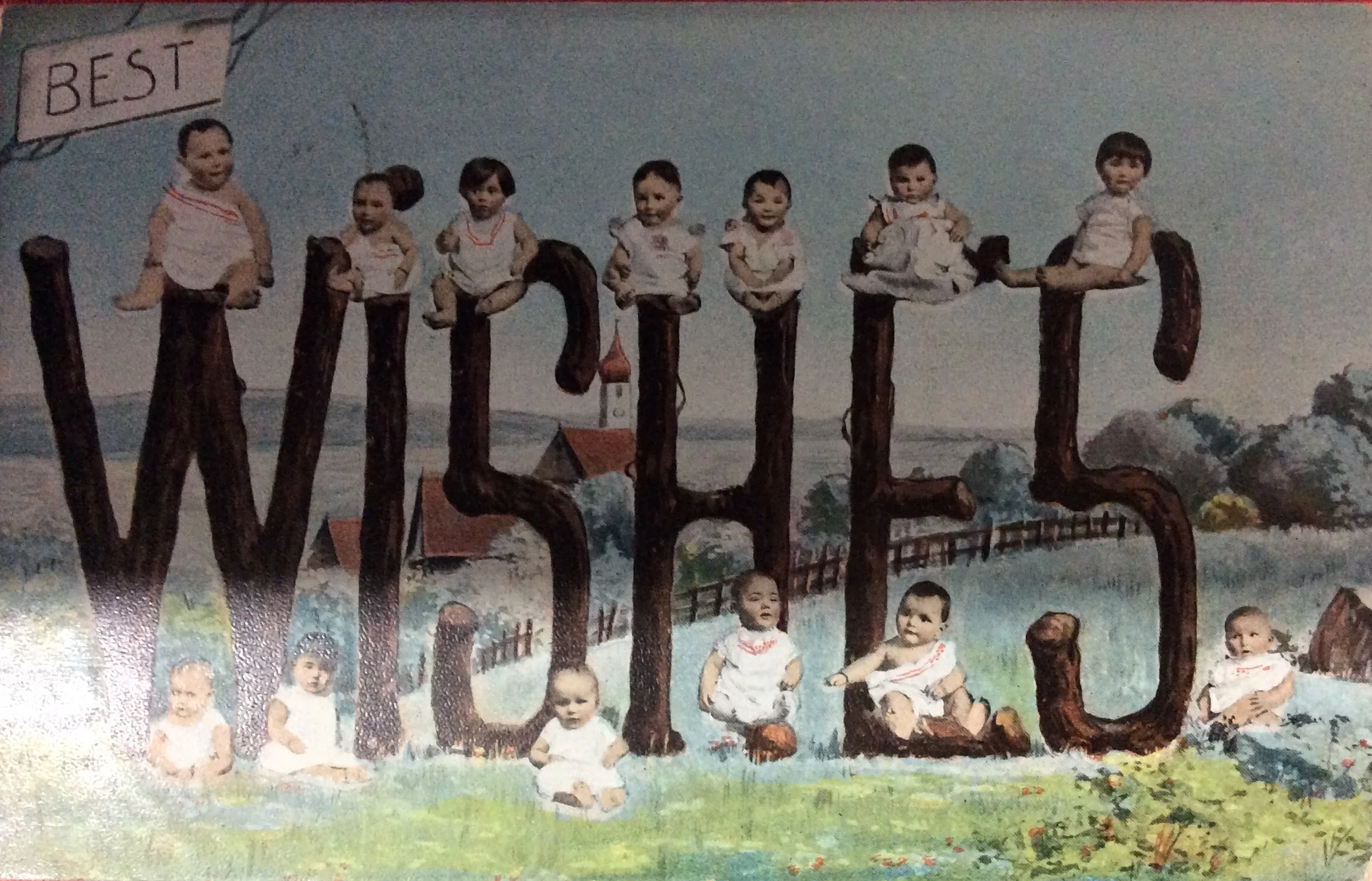 The card has very little to say except that in 1905 there were some truly awful cards and this is one of them. The picture is hard to describe. It is a collection of baby photos cut out and glued to what looks like the words Best Wishes constructed from tree branches. The whole thing being set against a rural background. it is very disturbing.