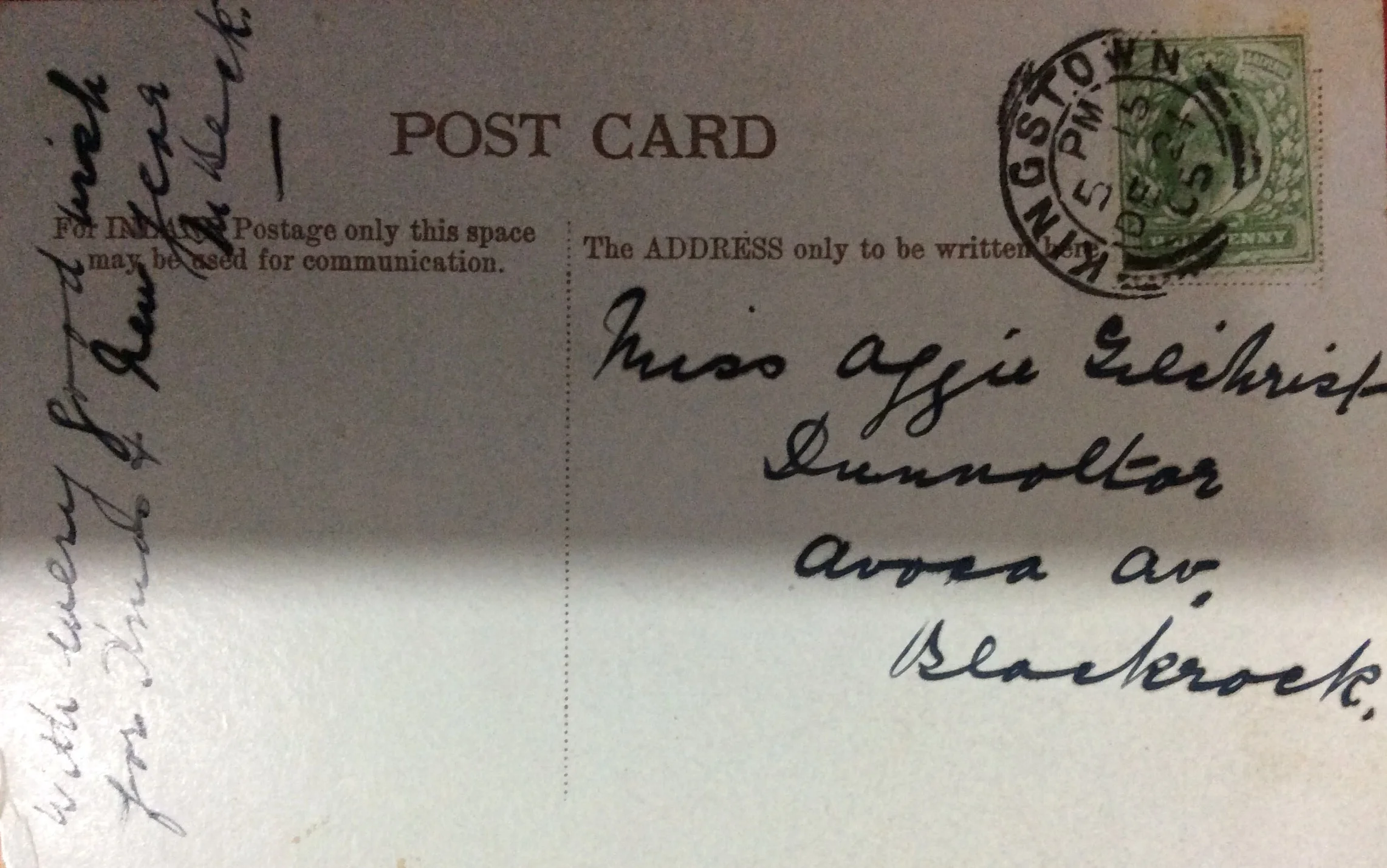 The other point of interest is that the card was posted in what is now known as Dun Laoghaire but which was known as Kingstown from 1821 to 1920. For political reasons presumably.
