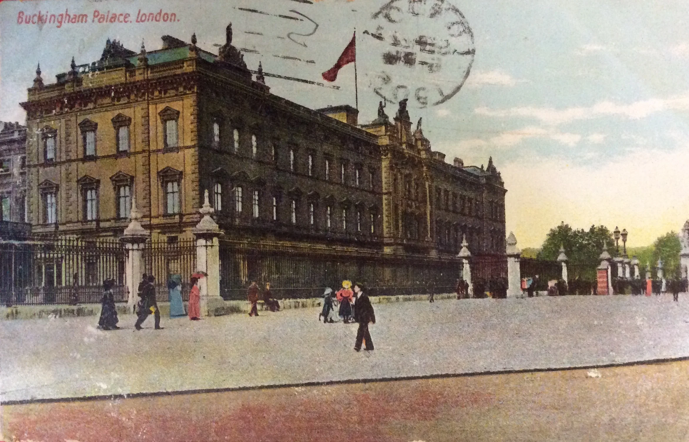 The picture is Buckingham Palace, home of the British monarch. (https://en.wikipedia.org/wiki/Buckingham_Palace) Today it is Queen Elizabeth II, but in 1905 it was her Great Grandfather Edward VII (https://en.wikipedia.org/wiki/Edward_VII).