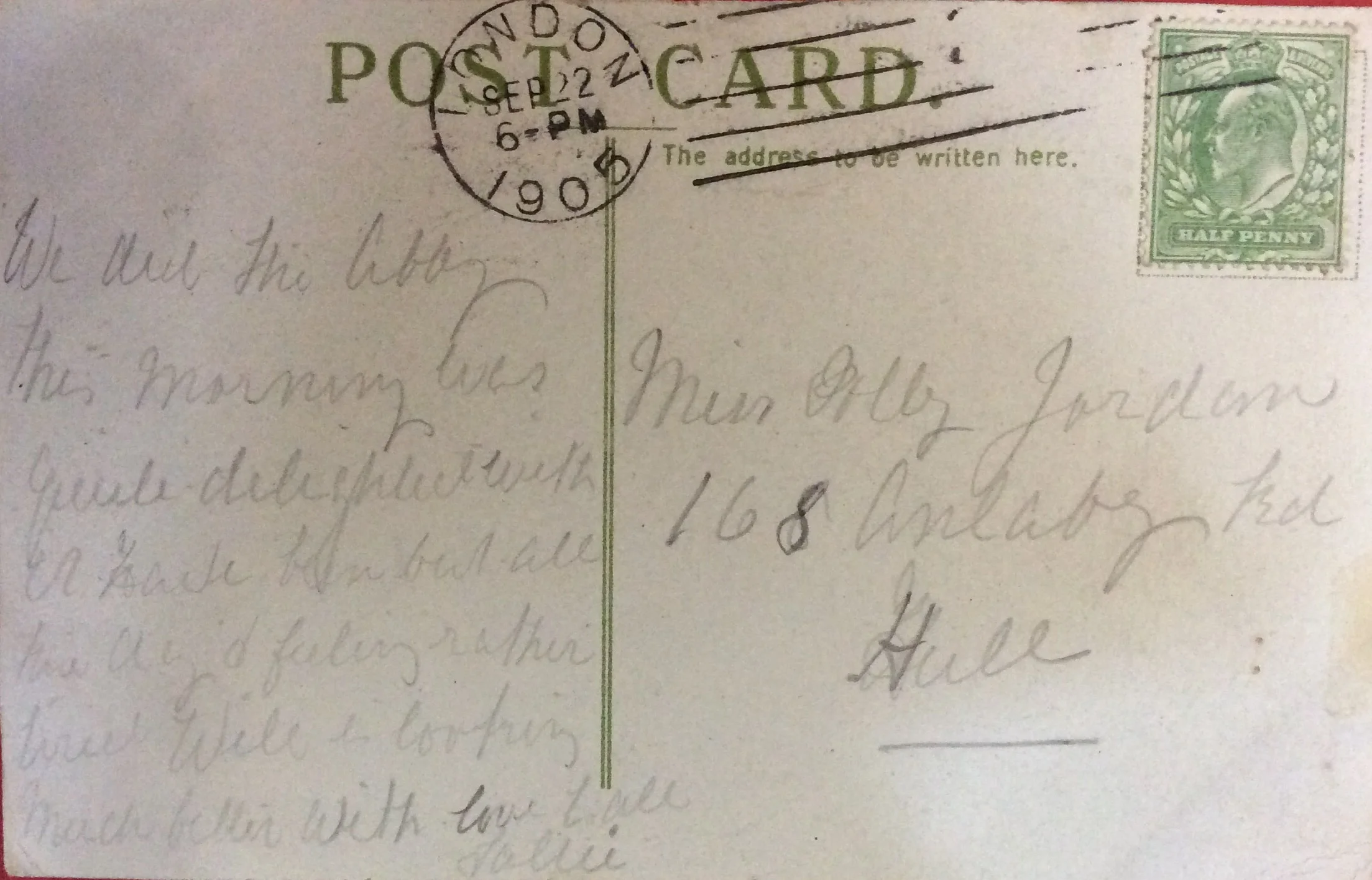 This is a typical London tourist postcard. The message refers to the Abbey which is presumably Westminster Abbey (https://en.wikipedia.org/wiki/Westminster_Abbey) another prominent London attraction.