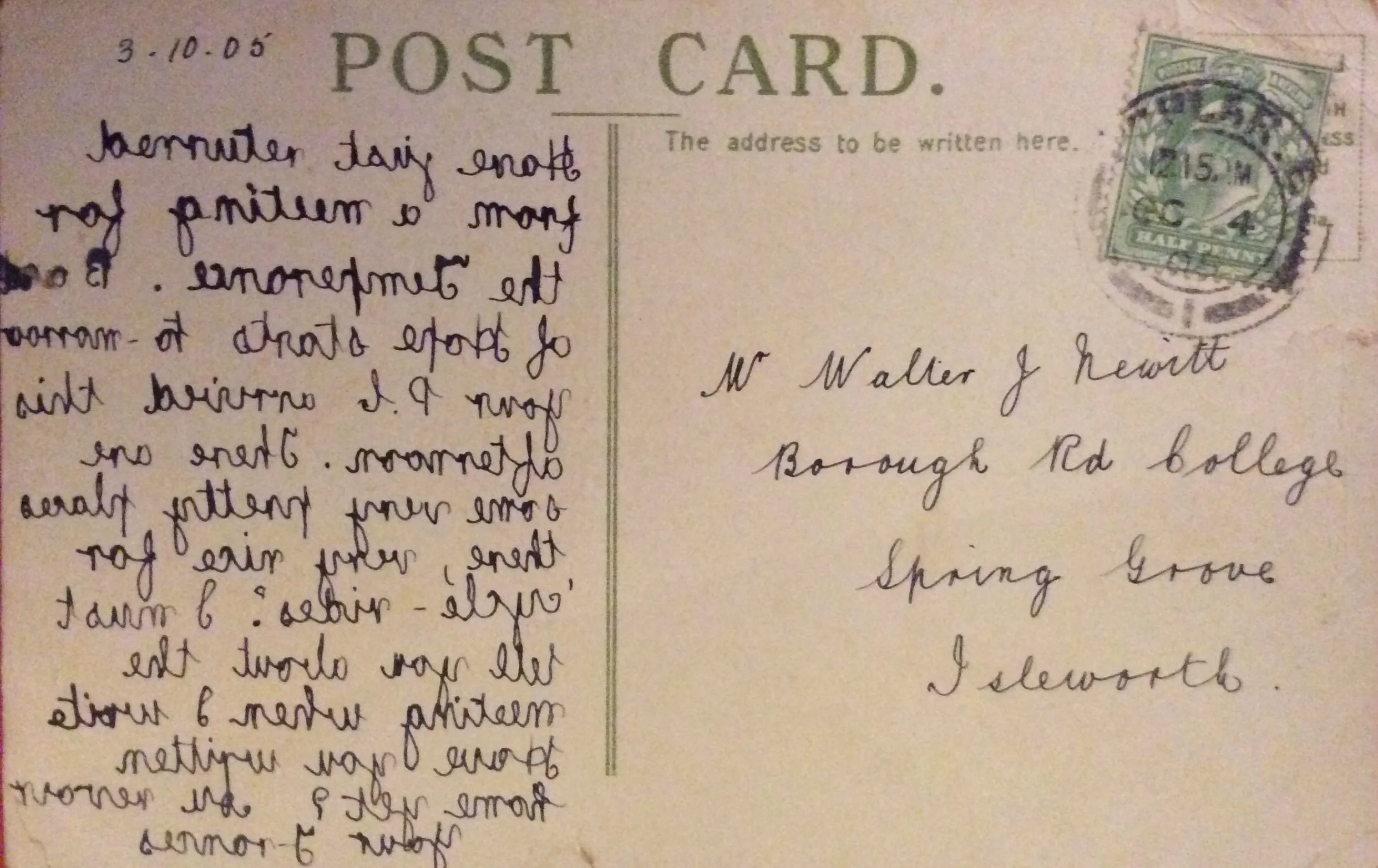 This is the fourth card in the Frances Mantz series. It is the second sent to Walter Newitt in Isleworth and both of those cards were written using mirror writing. This one was posted in Poplar rather than Victoria Docks, the Mantz family home. The card was sent about a week after the previous one, although the message refers to a card sent by Walter to Frances in between.
