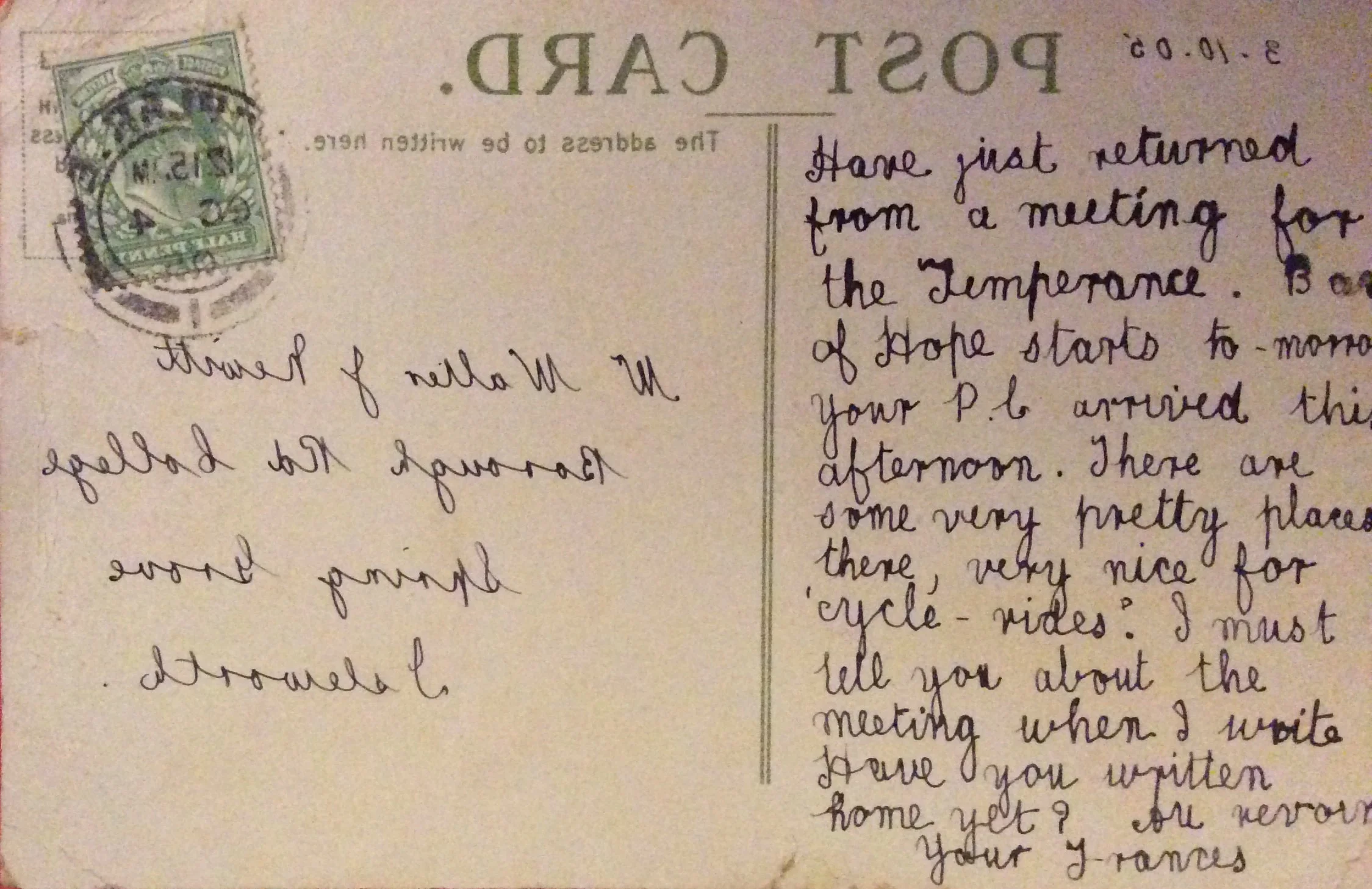 "Have just returned from a meeting for the Temperance. Band Of Hope starts to-morrow. Your PC arrived this afternoon. There are some very pretty places there, very nice for 'cycle-rides? I must tell you about the meeting when I write. Have you written home yet? All nervous