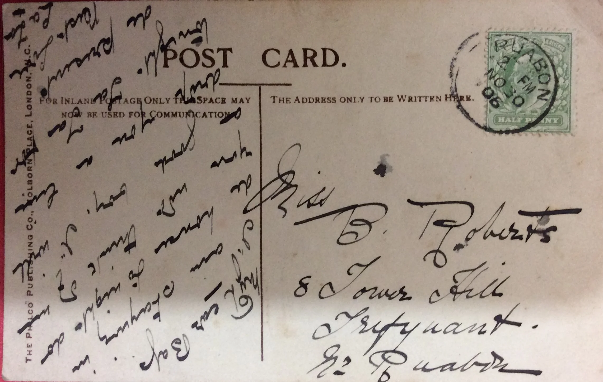 The recipient was Barbara Roberts (1890-?). She was 16 when she was sent the card. She was the daughter of Joseph Roberts (1859-?) and Sarah Ellen Peake (1858-?). She had three siblings Thomas W (1185-?), Richard H (1887-?), and Llewyllyn (1892-1924). Barbara's father and brothers worked at a brickworks, there being several in the area around this time. Barbara is present with the family in the 1901 census, but by 1911 she is gone. It has not been possible to find out if she has died, married or just left. The whole family has proved difficult to trace. Unusually for this time, although Joseph was born in Llangollen, not far from Ruabon, his wife, Sarah, was born in Grindley Brook in Shropshire and even more unusually, the oldest son, Thomas was born in Barrow-In-Furness. Obviously the family travelled and perhaps that is why it is difficult to track them after 1911.