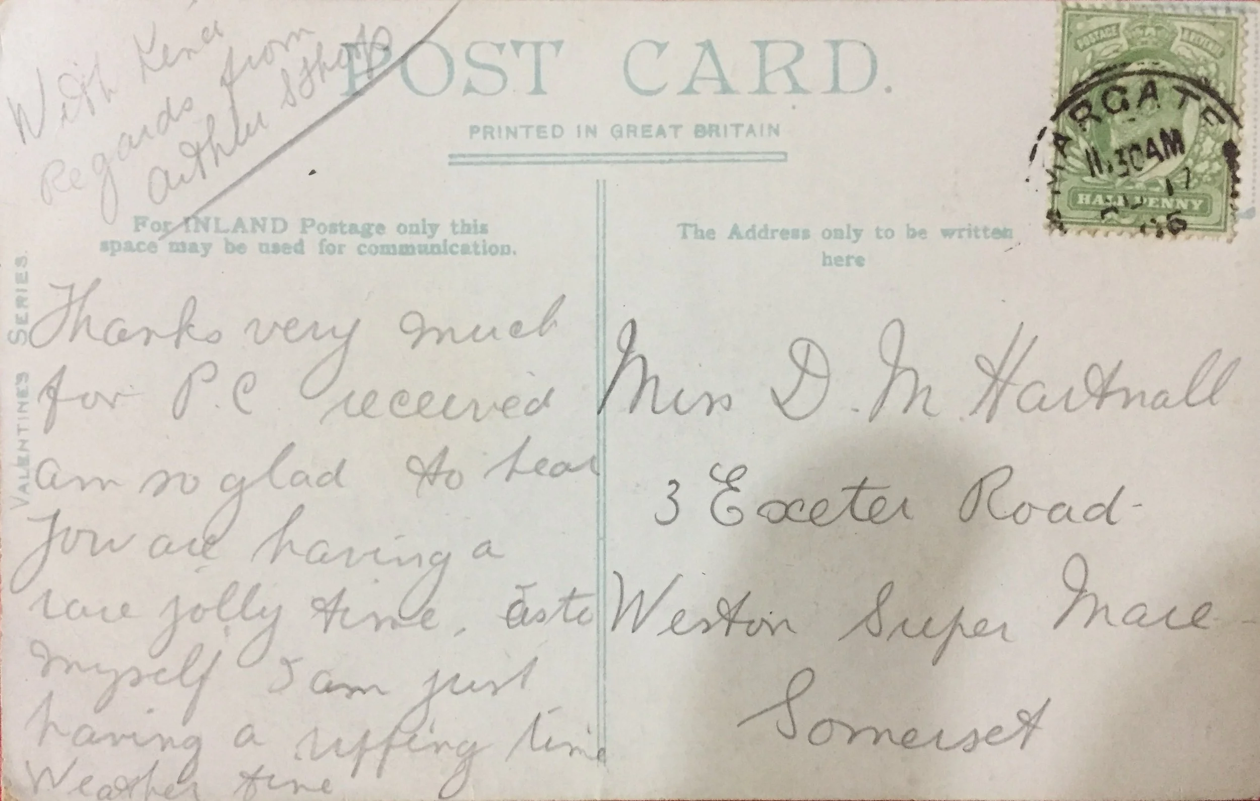 Otherwise the card tells us that Daisy was in Somerset in August 1906 and Arthur was in Margate. They were probably both on holiday or staying with family or friends. Somerset crops up elsewhere amongst the Hartnall cards.