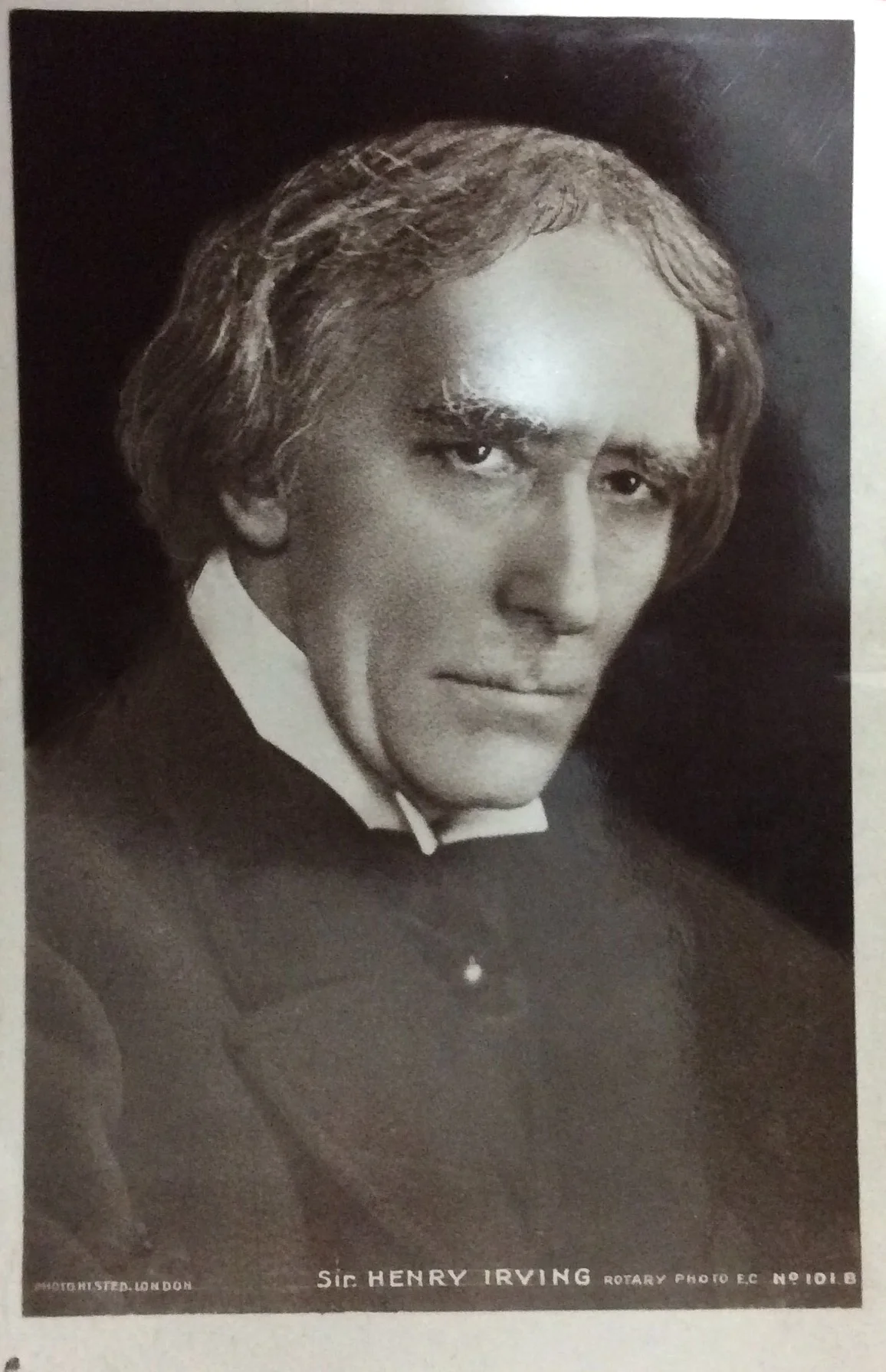 The picture shows Sir Henry Irving, the actor manager, who appears to have no connection to the recipient. https://en.wikipedia.org/wiki/Henry_Irving