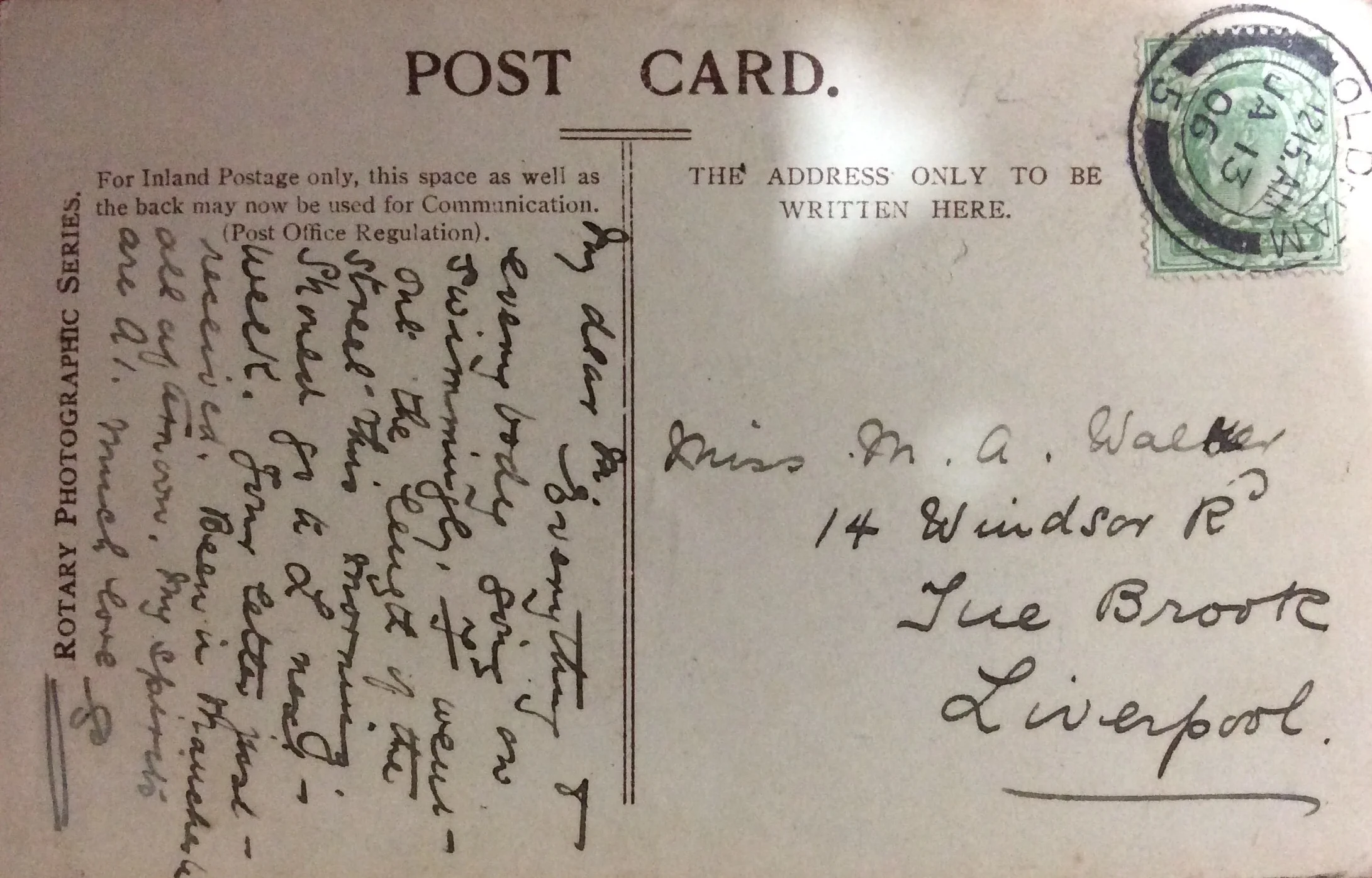 The message is quite curious. What is the significance of the phrase "I went out the length of the street"? Was the sender ill? If so, how would they be able to go to L (Liverpool possibly) or Manchester?