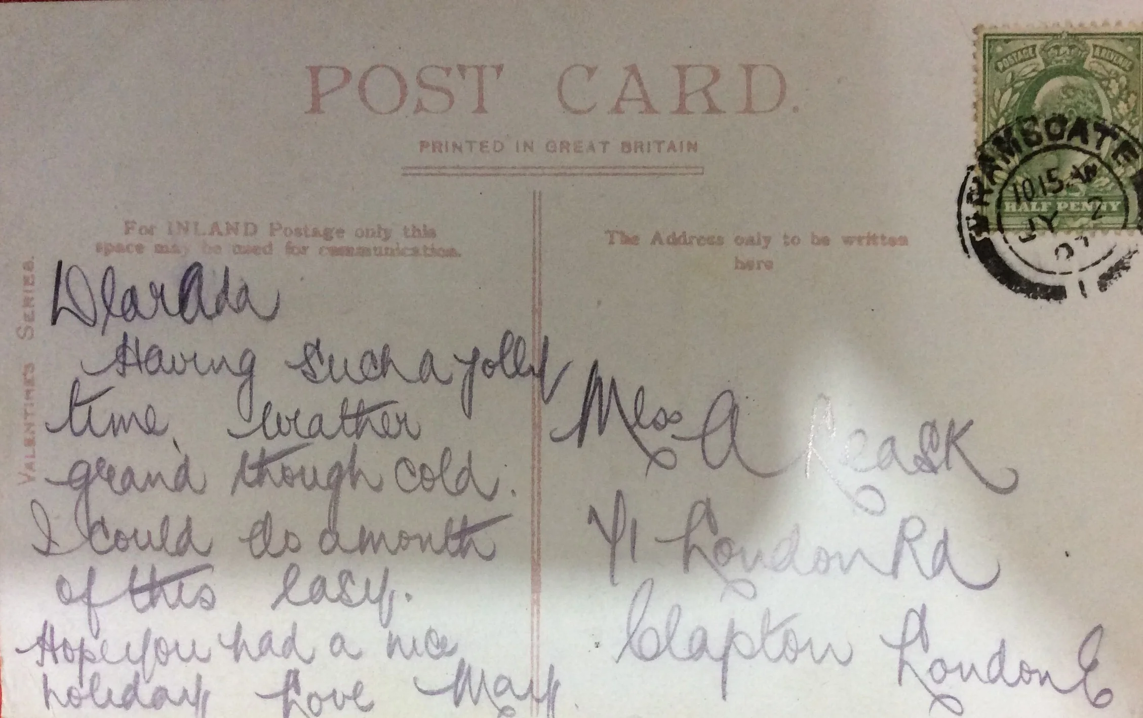 The card itself is a simple update on the weather in Ramsgate in July 1907 and it was cold.