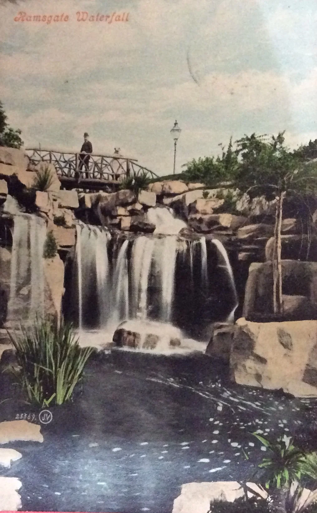 The picture is of Ramsgate Waterfall which appears to have no connection to the message. There is interesting period detail of a man and a little girl.