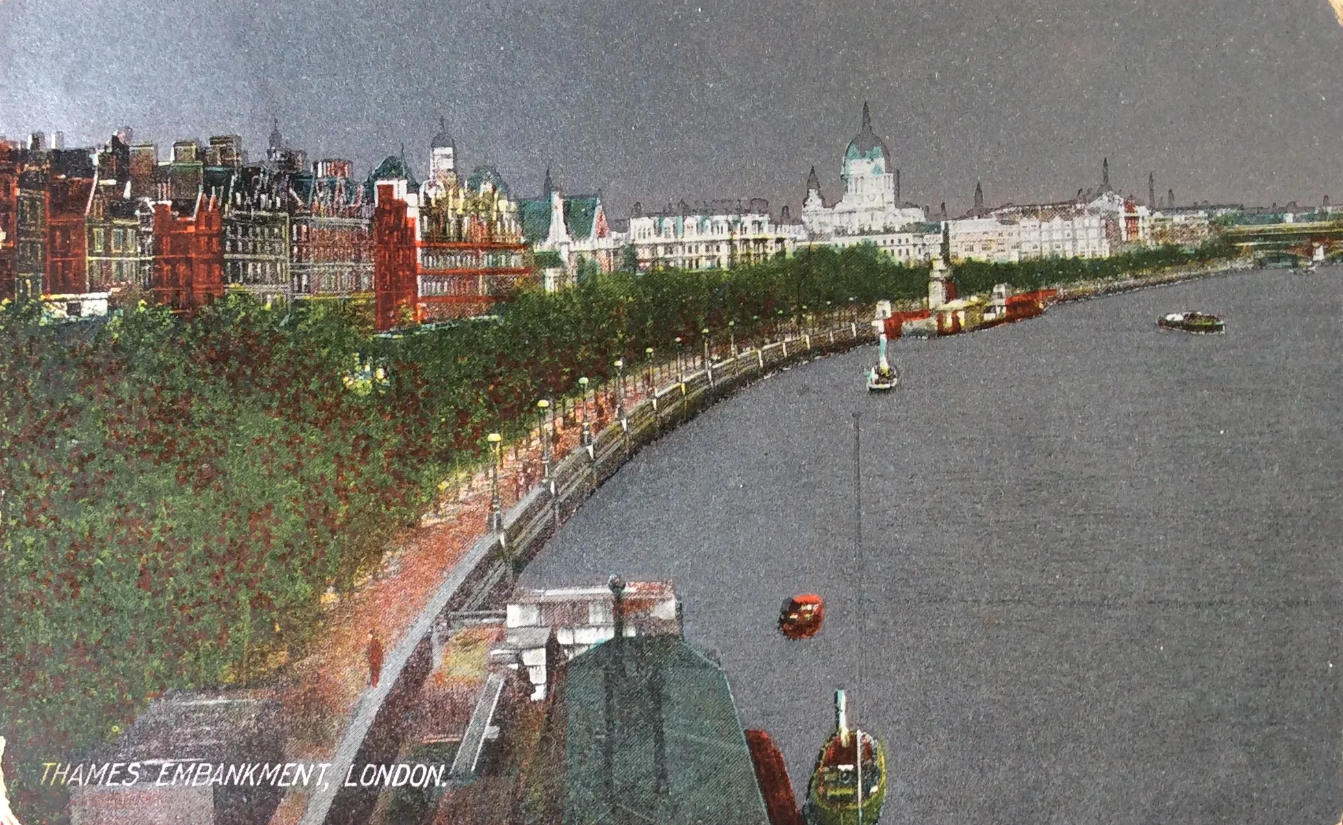 The picture shows the Thames Embankment in London. The picture has been coloured using metallic paints.