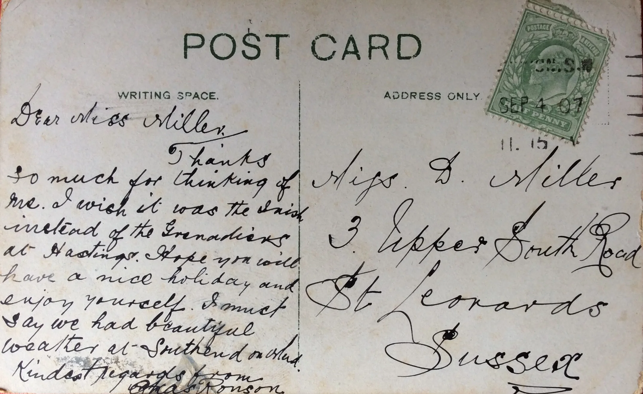 It can be inferred that Chas Ronson is an Irish Guard and also that he wishes he was in Hastings with Miss Miller. Precisely what the relationship between them was and whether it developed any further would be pure speculation.