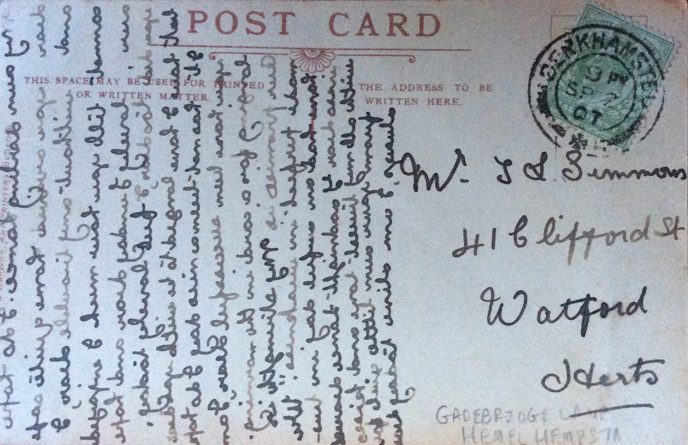 The recipient is Thomas Lance Simmons (1885-1963). When he received this card he was 21. In 1901 he was living in Watford with his parents at 34 Clifford Street. On the census he was entered simply as Lance. His parents were John Tapley Simmons (1861-1939) and Mary Ann Elizabeth Ashby (1861-1951). The occupation for both John and Lance was given as "hairdresser". Does that mean barber or stylist in 1901? By 1911 Lance is married and living with his wife and son (also called Thomas Lance (1910-1992) at another address in Watford. He is still a hairdresser. They go on to have two further children Ernest Eric (1912-1988) and Leonard John (1914-2000). Lance served in the Royal Engineers is WWI