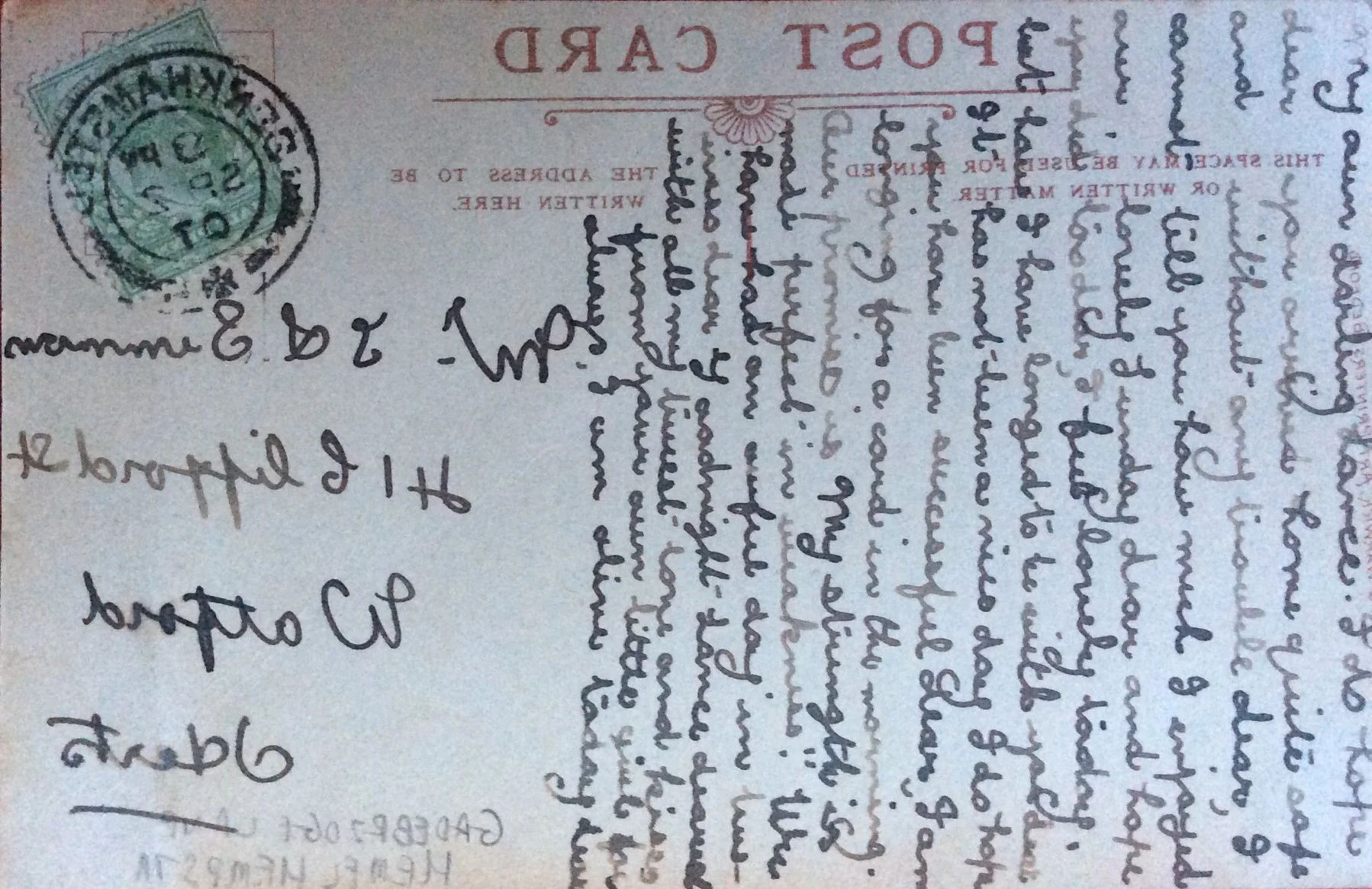 This is the first of four postcards, all posted in September 1907. They are written by the same person and they are unsigned. What is unusual about them is that the message on each is written in mirror writing and mirror writing that looks very natural as if it is the most normal thing in the world. Another interesting feature of this one is that it is written with a pen being dipped in ink repeatedly as you can see the words fading and then becoming bold again as the ink runs out and is refreshed. It is difficult to get a figure for how many people can write like this although it is almost always left handed people. Although there is research that suggests that left handedness used to be regarded as a sign of developmental difficulties (e.g. http://www.ncbi.nlm.nih.gov/pmc/articles/PMC2117809/ ) the phenomenon does not seem to have been the subject of dedicated study. In this case we have to assume that the writer had this gift and that there was a good reason for using it, maybe as a primitive form of cipher to avoid other people being able to read the messages without going to the effort of finding a mirror.