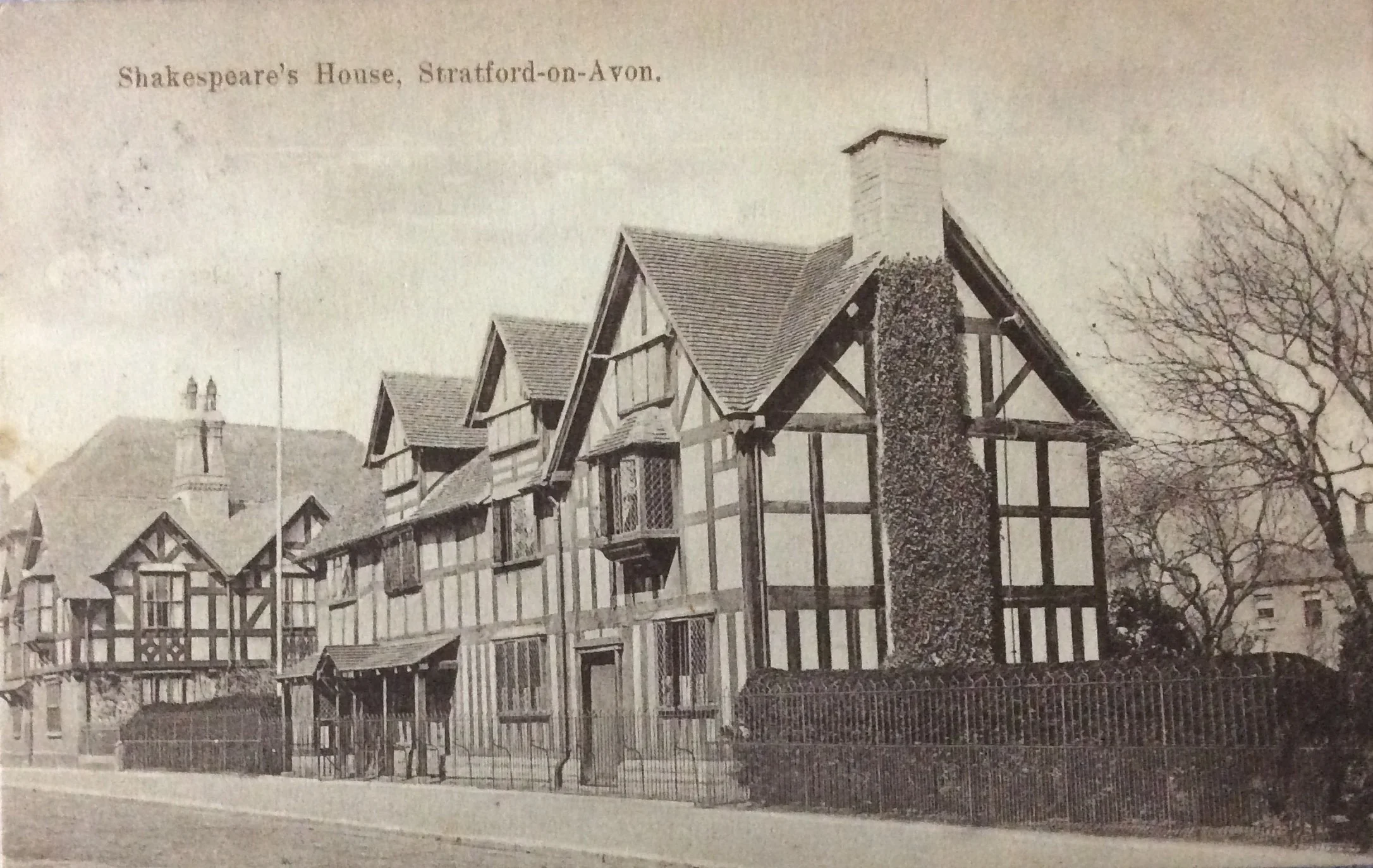 The picture shows Shakespeare's house in Stratford-On-Avon and that is where the card was sent from. (https://www.shakespeare.org.uk/visit/shakespeares-birthplace/)