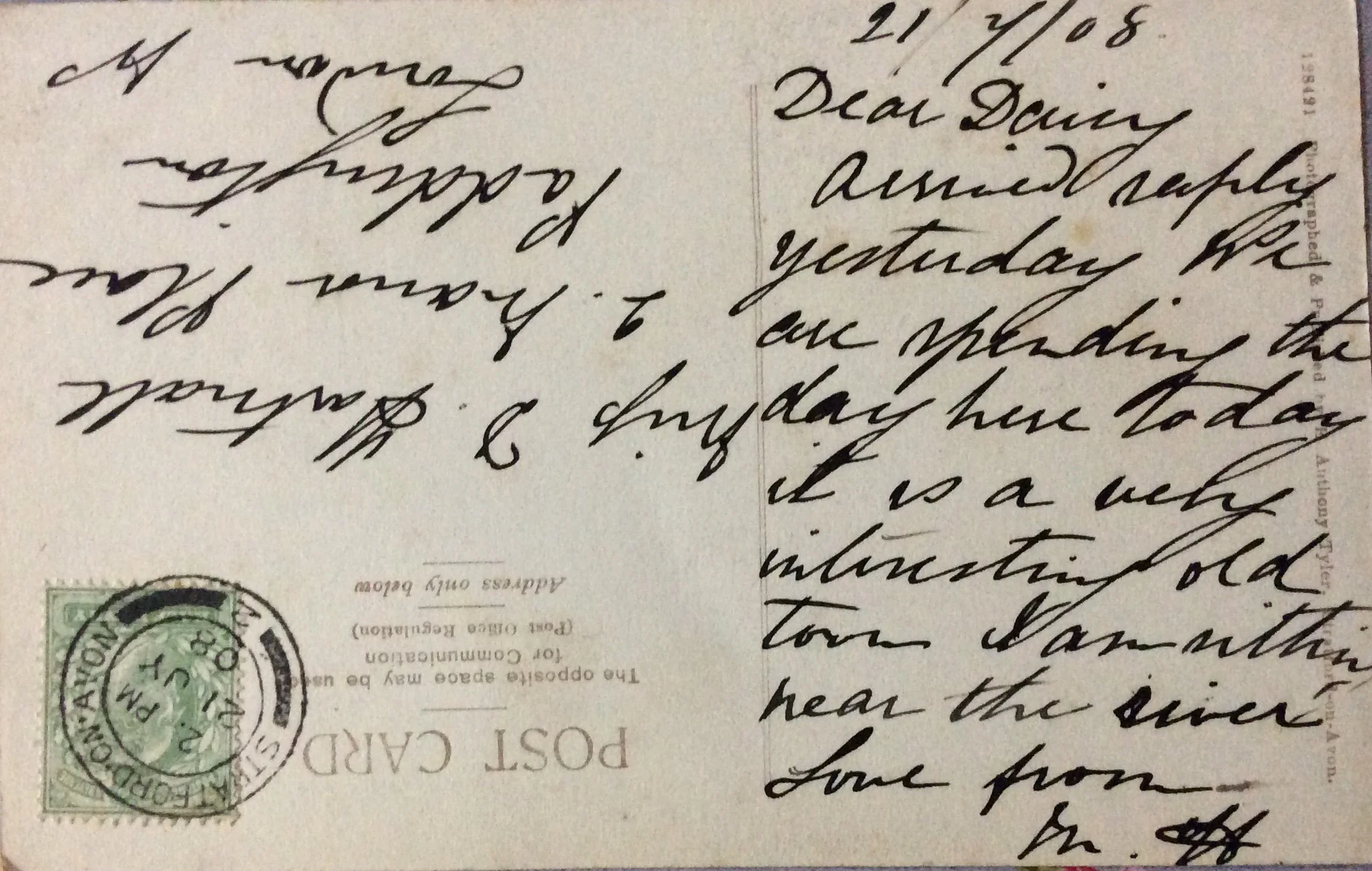 This is one of several cards in the gallery sent to Daisy Hartnall in 1908. The sender is probably one of her siblings, but the signature is not clear.