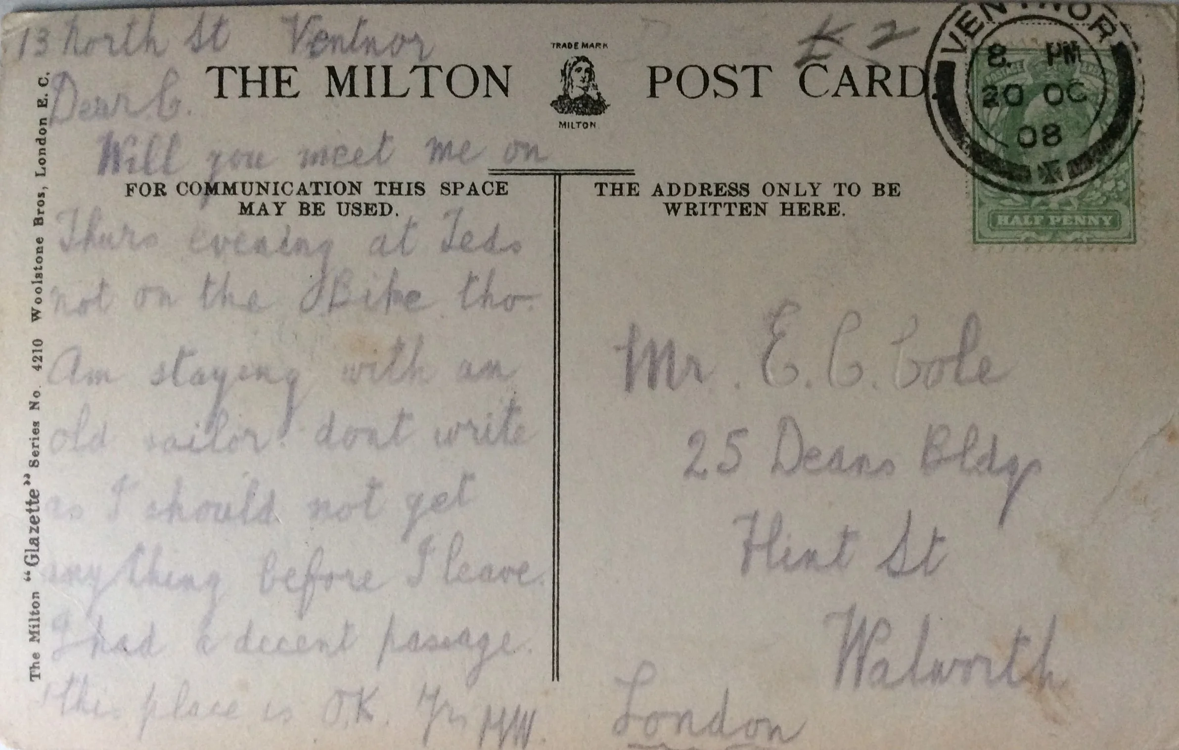The picture on the card is of Hexthorpe Flatts in Doncaster and shows a sailing barge of some kind. You would have thought that a card sent from the Isle of Wight would show a scene of the Isle of Wight.