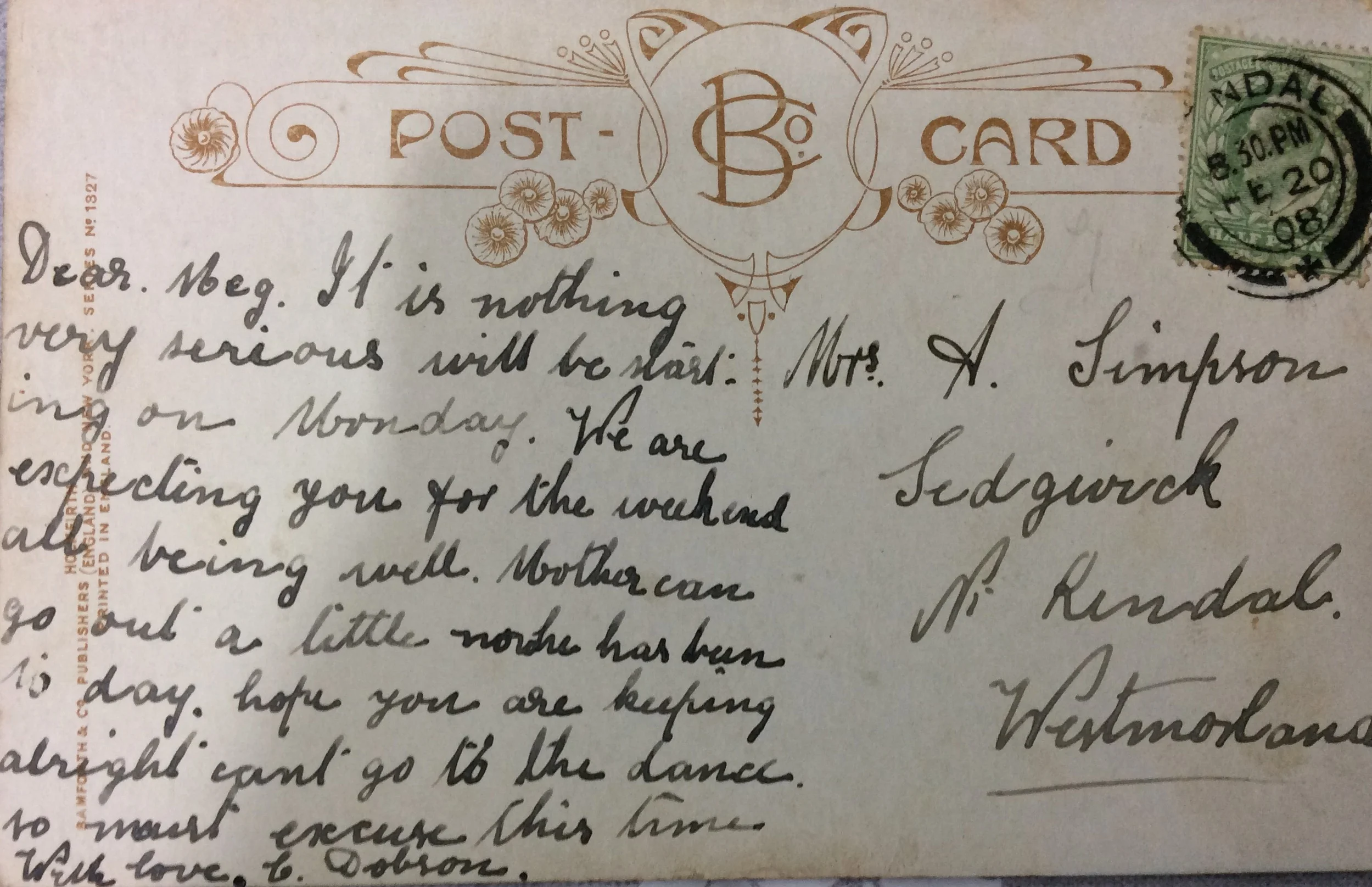 Charles David Dobson (1885-1944) was the eldest child of John Dobson (1839-?) and Charlotte Ann Smith (1857-?). John worked on the railway as a signalman. Charles worked at the gunpowder works at Sedgwick. In 1911, 3 years after sending this card, Charles marries the recipient. Below is a picture of Charles and Margaret courtesy of Mary Birkett, Margaret's Great Neice.
