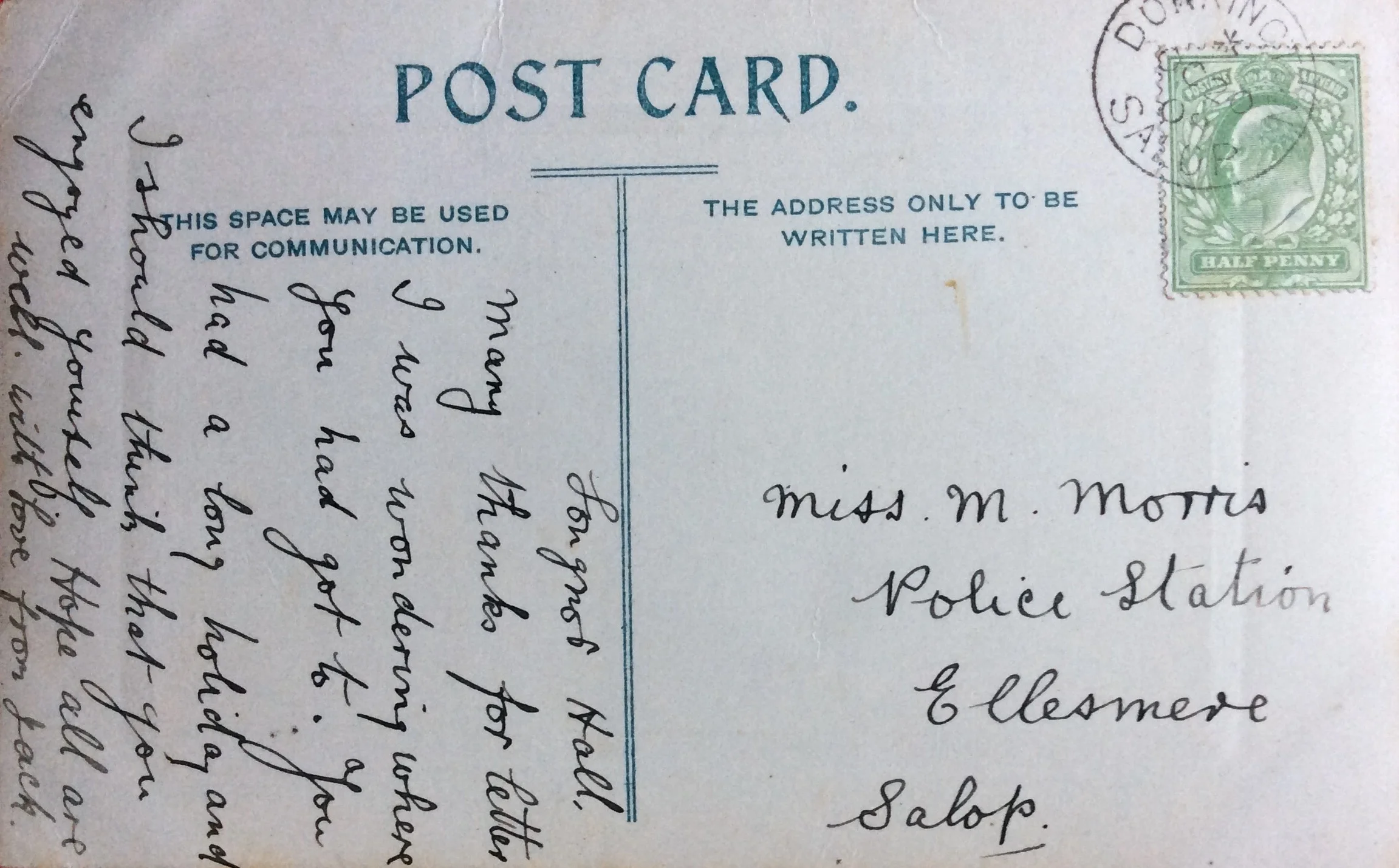 The recipient was Mary Emma Morris (1887-?). Mary was the eldest of four children. Her parents were Arthur Morris (1862-?) and Emma Walker (1857-?). The siblings were Arthur John (1889-?), George Charles (1891-?) and Adelaide Victoria (1897-1986). Arthur was a police officer. In 1908 the family were at the Police Station in Ellesmere having previously been in Wellington in 1901 and Market Drayton in 1891. Mary was born in Market Drayton. By 1911 Arthur had retired and the family were living at a property in Ellesmere called "Cremorne". Mary was an Elementary School teacher as was her brother Arthur John.