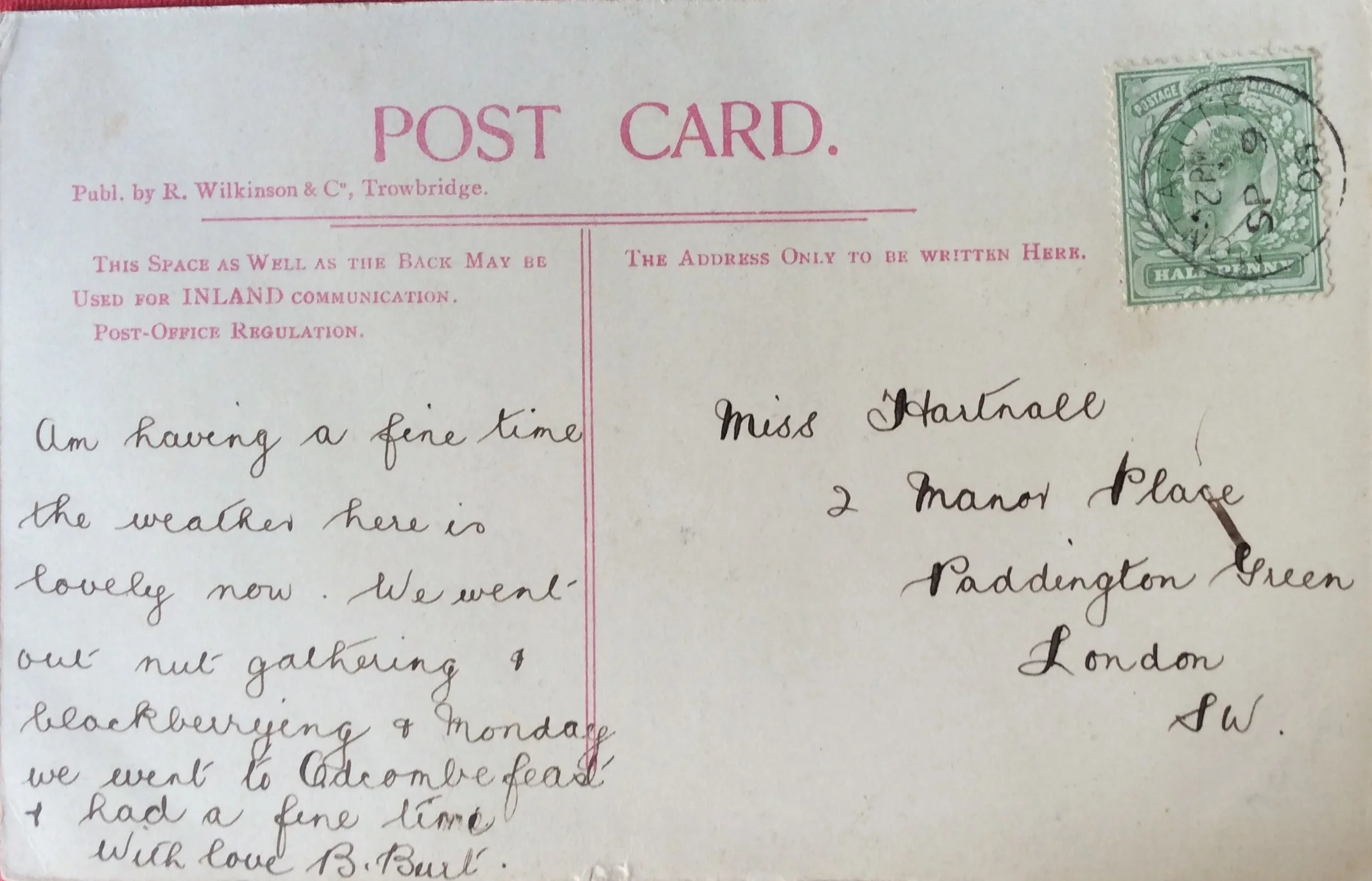 "Am having a fine time the weather here is lovely now. We went out nut gathering + blackberrying + Monday we went to Adcombe feast + had a fine time.