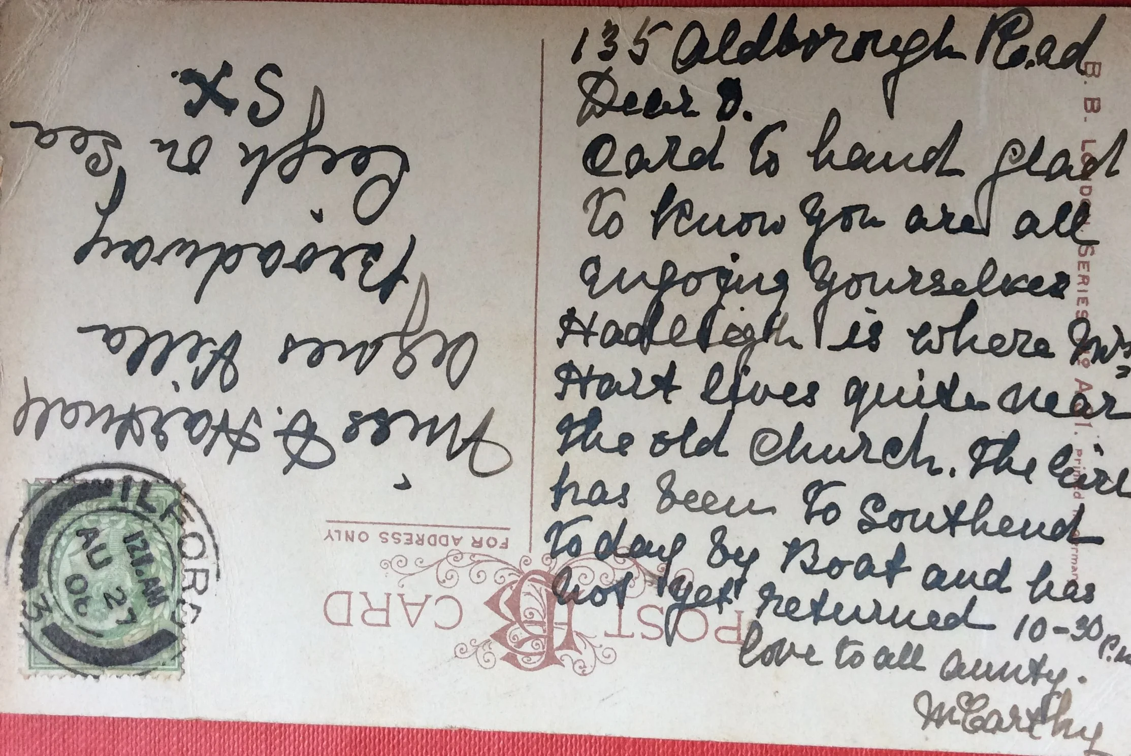 The address that it was sent to suggests that Daisy was on holiday by the sea at Agnes Villa which sounds very grand but does not seem to exist any more. This is odd because usually the card is sent by the holiday maker. It also suggests that it is not just Daisy. Daisy's mother used to be in service with a Mrs Hart and this may the person referred to as living near Hadleigh. There are no clues as to who the girl who has gone to Southend might be.