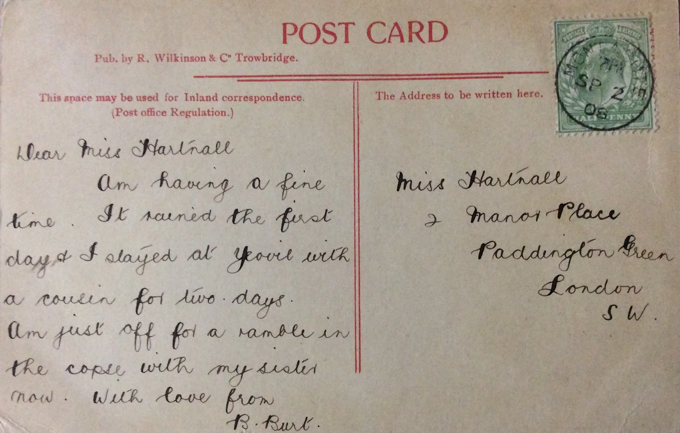 This is one of two cards sent by B. Burt to Miss Hartnall. This one on September 2nd and the other a week later on September 9th.