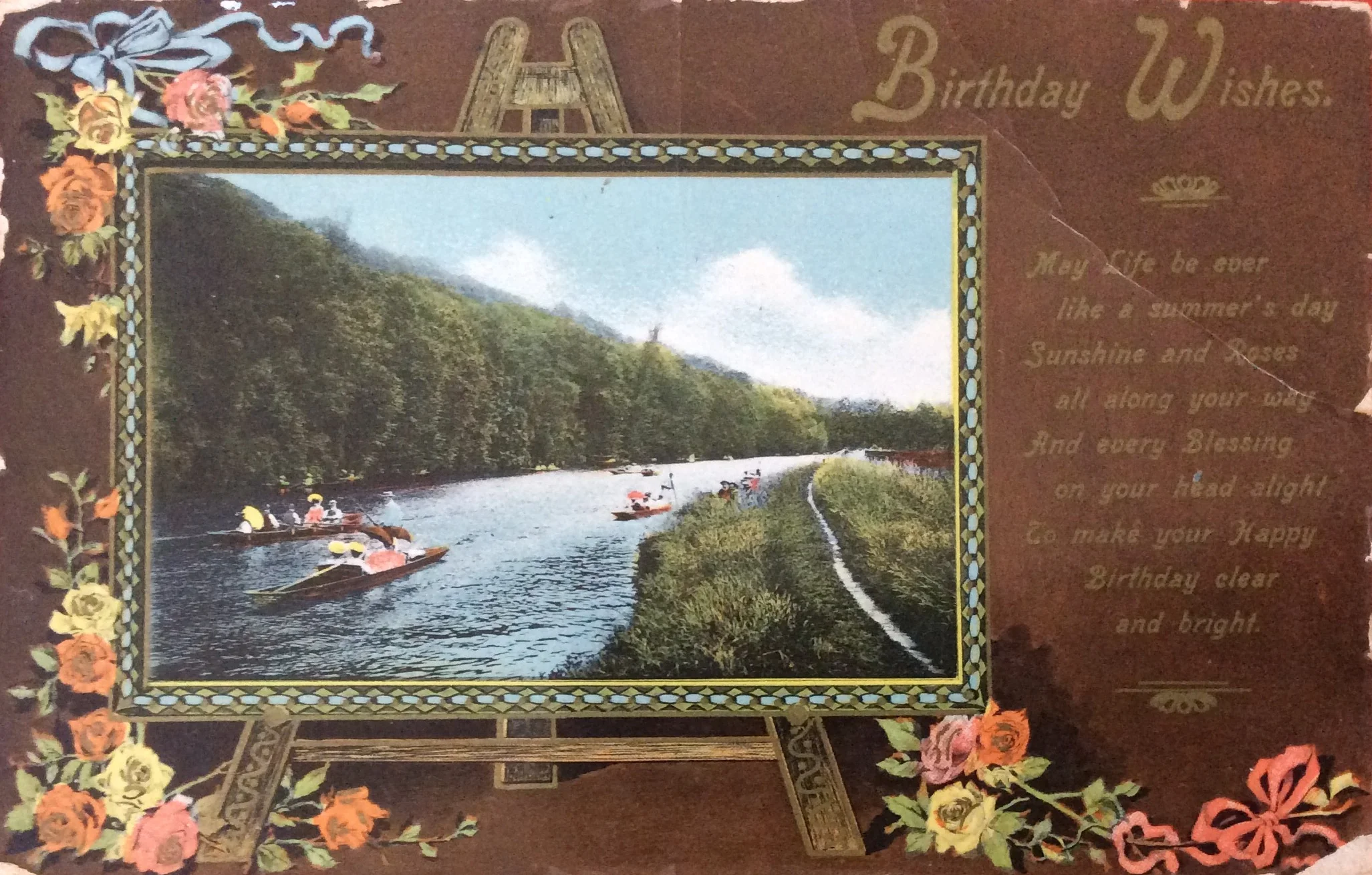 The picture is of a framed picture of people punting that has been placed on an easel. It is hard to believe that the background of brown is the original colour because it does not seem appropriate for a birthday card.