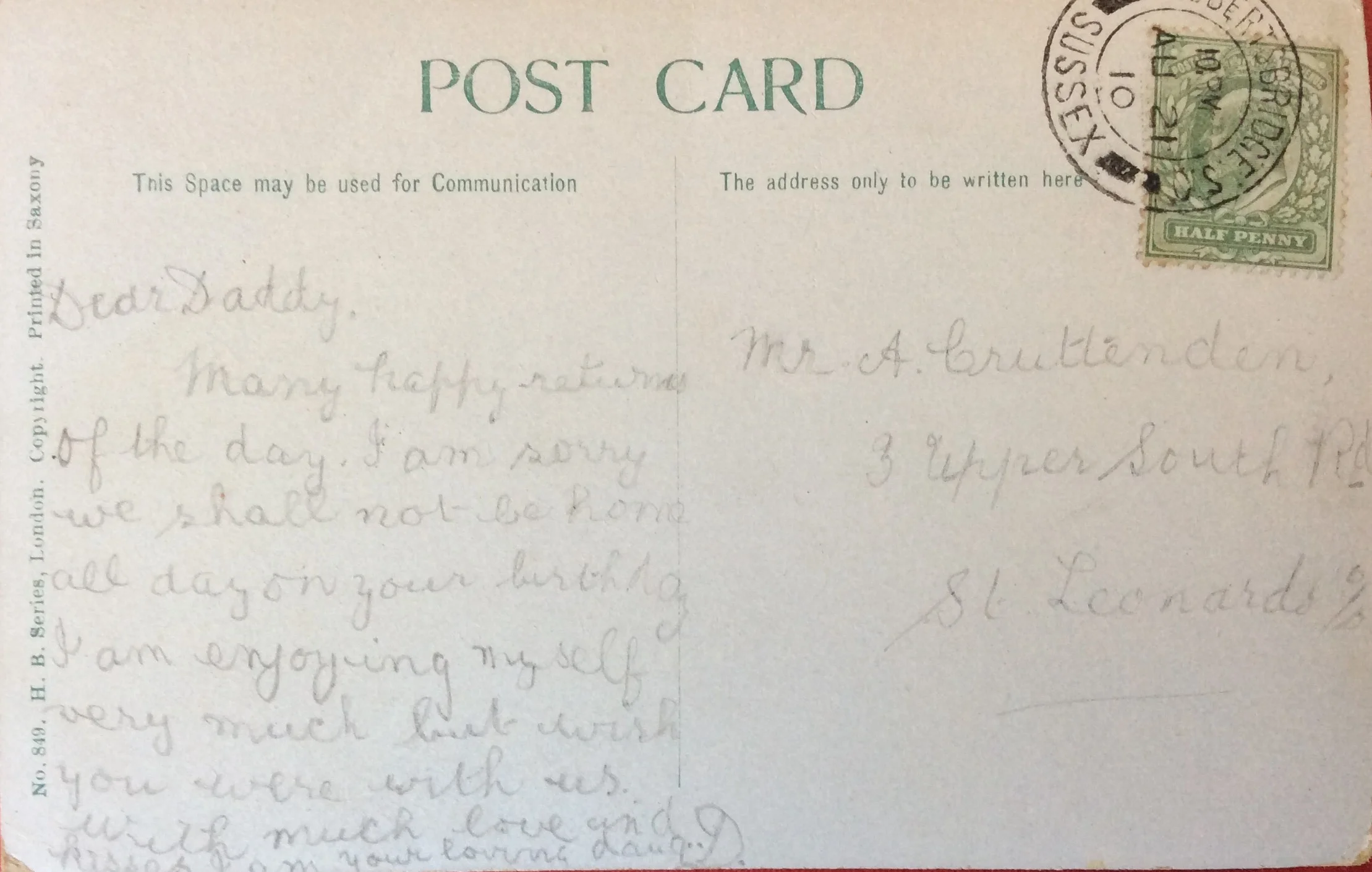 The card itself is a birthday card from a daughter to her father. Dorothy was 13 when she sent the card. There are no clues as to why she was away from home in Robertsbridge. And it's cute that she signs off with "much love and kisses" although adding "your loving daughter" is possibly over the top.