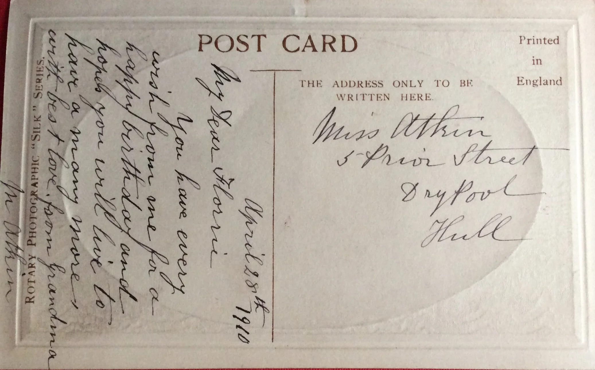 Florrie Atkin (1889-1979) was the daughter of Thomas William Atkin (1859-1950) and Betsy Cross (1863-1949). Thomas was a dock labourer at a timber yard. Florrie never married. She was the granddaughter of the sender Mary Ann Atkin nee Askew.