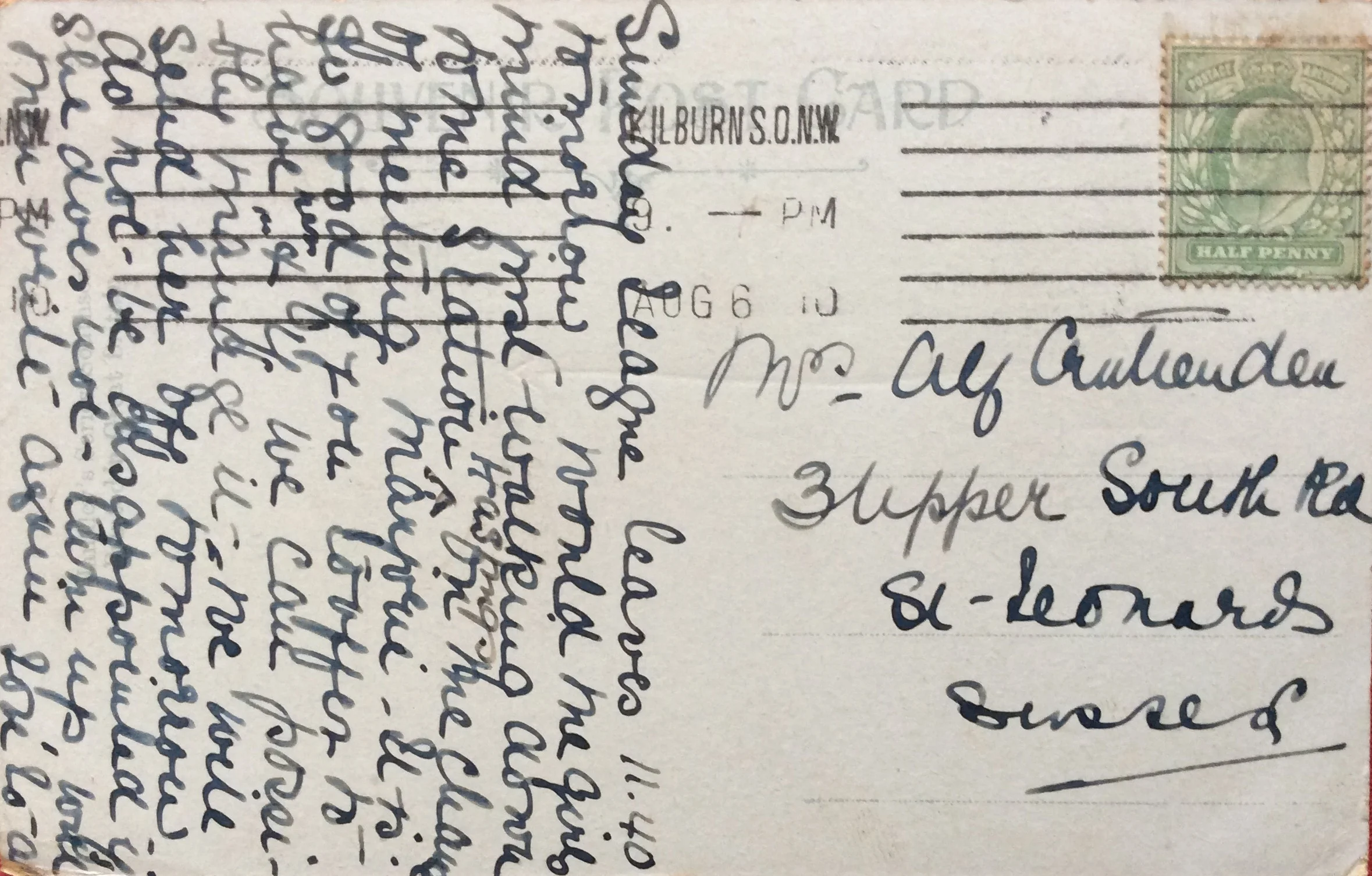 "Sunday league leaves 11.40 tomorrow. Would the girls mind just walking down to the station (Hastings) on the chance of meeting Marjorie. It is so good of you to offer to have her + if we can possibly manage it, we will send her off tomorrow. Do not be disappointed if she does not turn up. Will ??? write again