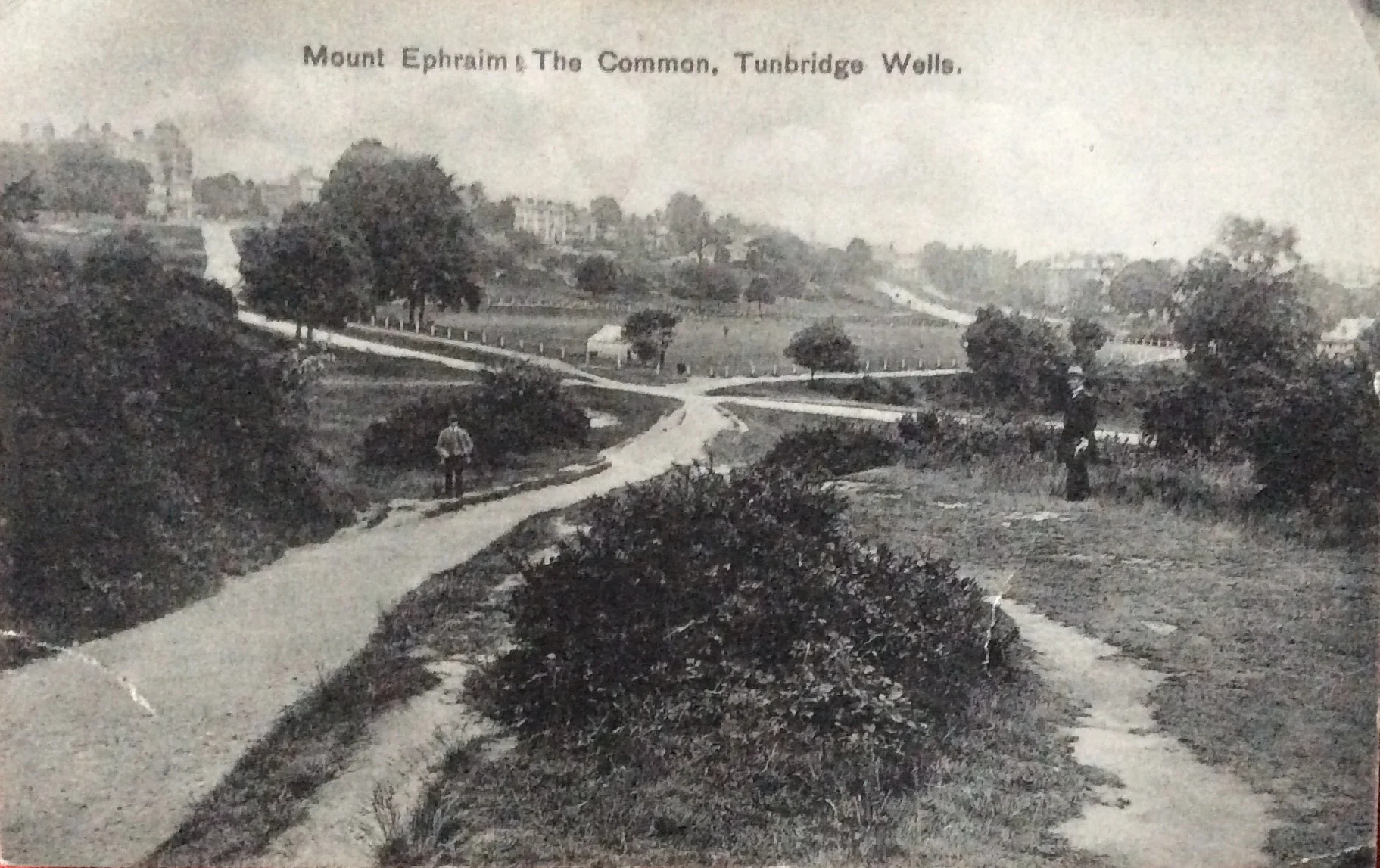 The picture is a photograph taken in Tunbridge Wells in Kent and shows Mount Ephraim and the Common. Mount Ephraim is a stately home. The most interesting thing in the picture is the two men on either side of the road looking back at the camera as if it is a picture of them, which of course it is not.