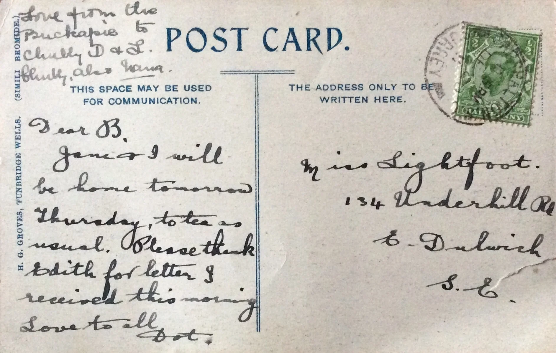 There are other people referred to in the card. Edith is probably Bessie's youngest sister Edith Mabel (1890-1962) who appeared to escape catering by training as a teacher, although for all we know she may have become a cookery teacher. Jane is a mystery as is Maria. And then there are the names that look like nicknames, or maybe pets in the writing in the top left of the card which don't really make sense. Particularly curious is "love from the Buckapie" if that is what is says. What is meant by "buckapie"? Is it a place or a catering establishment? If only we knew.