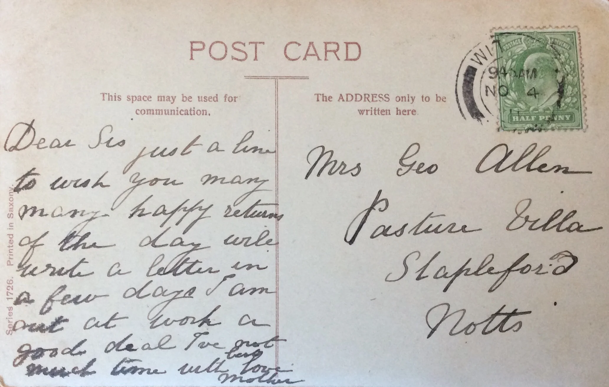 Just a line to wish you many many happy returns of the day. Will write a letter in a few days. I am out at work a good deal. I've not much time