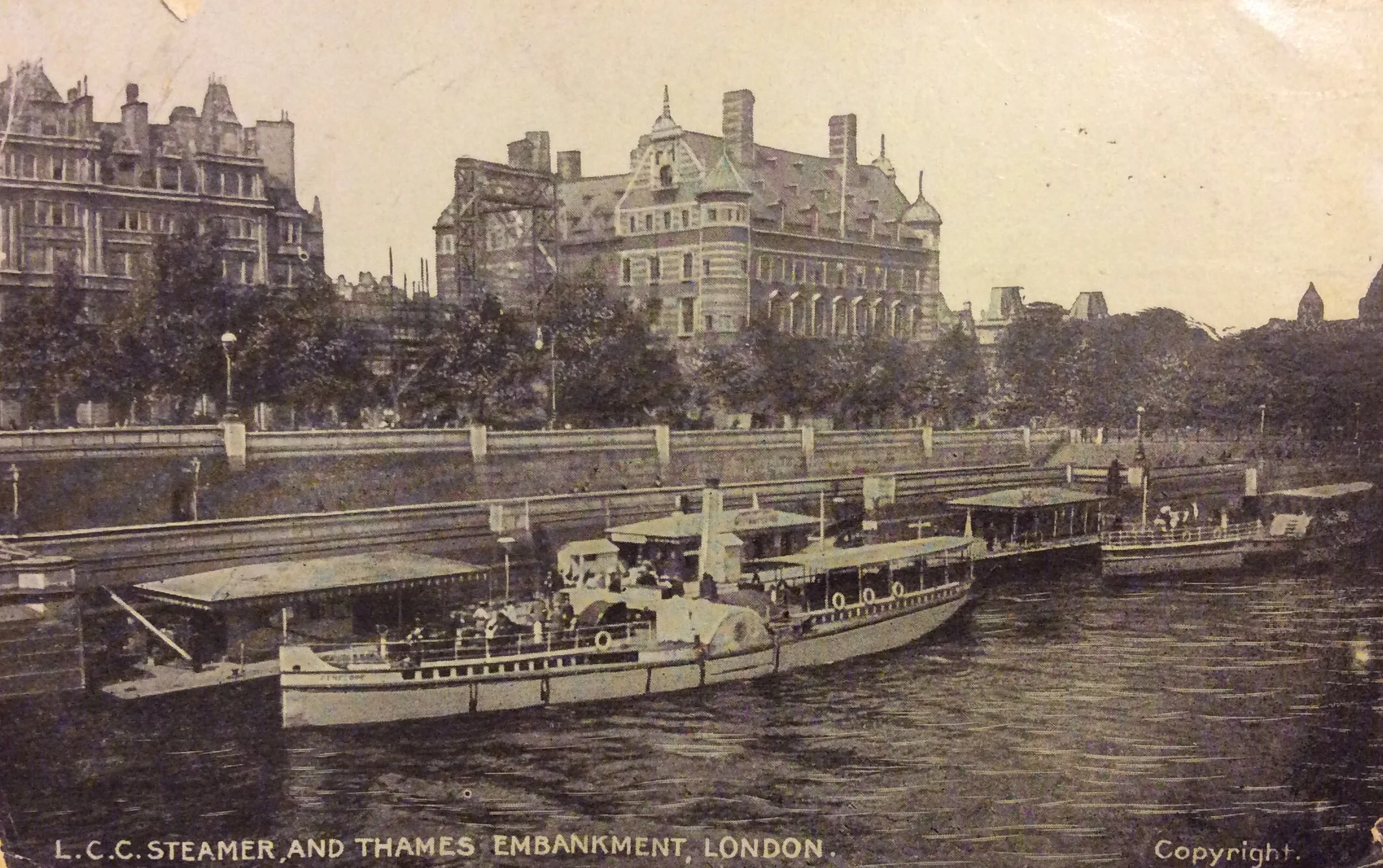 The picture shows a London County Council Steamer on the River Thames. This card dates from 1912 but the service was only in operation between 1905 and 1907 and failed due to huge debts. (https://en.wikipedia.org/wiki/London_River_Services) It is odd that a 1912 card would depict that service but it is not known when the card was originally purchased.
