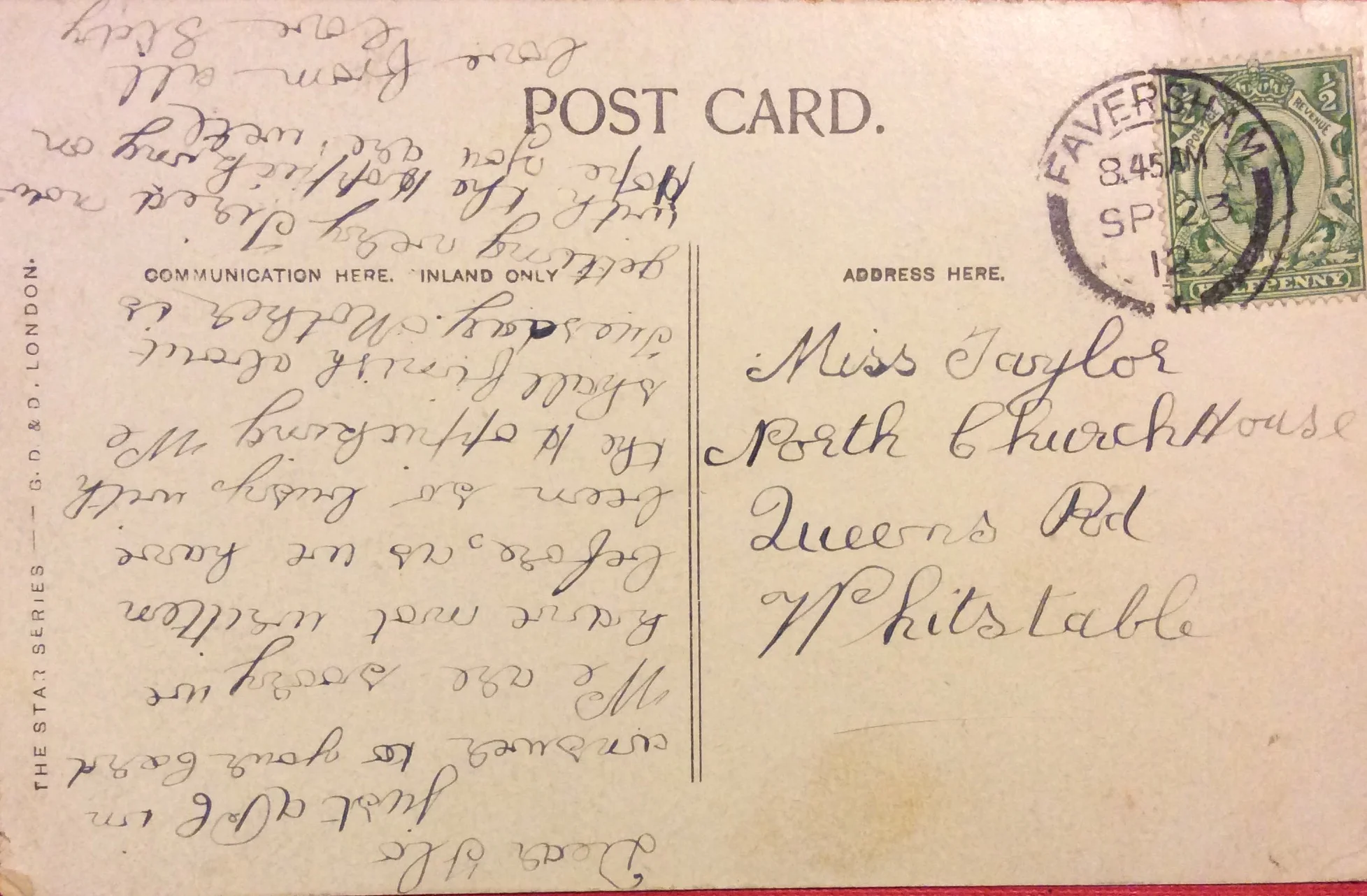 The message is interesting because it makes to references to hoppicking (also known as hop picking or hopping). This was a big industry in Faversham at this time and today there is a commemorative festival. (https://www.favershamhopfestival.org/index.php/hop-picking-in-faversham). This would have been an additional source of income for the Taylor family. It is not clear whether they owned a hop farm or were just casually employed. This would have been an important time of year and they were probably missing Florence while she was working away.