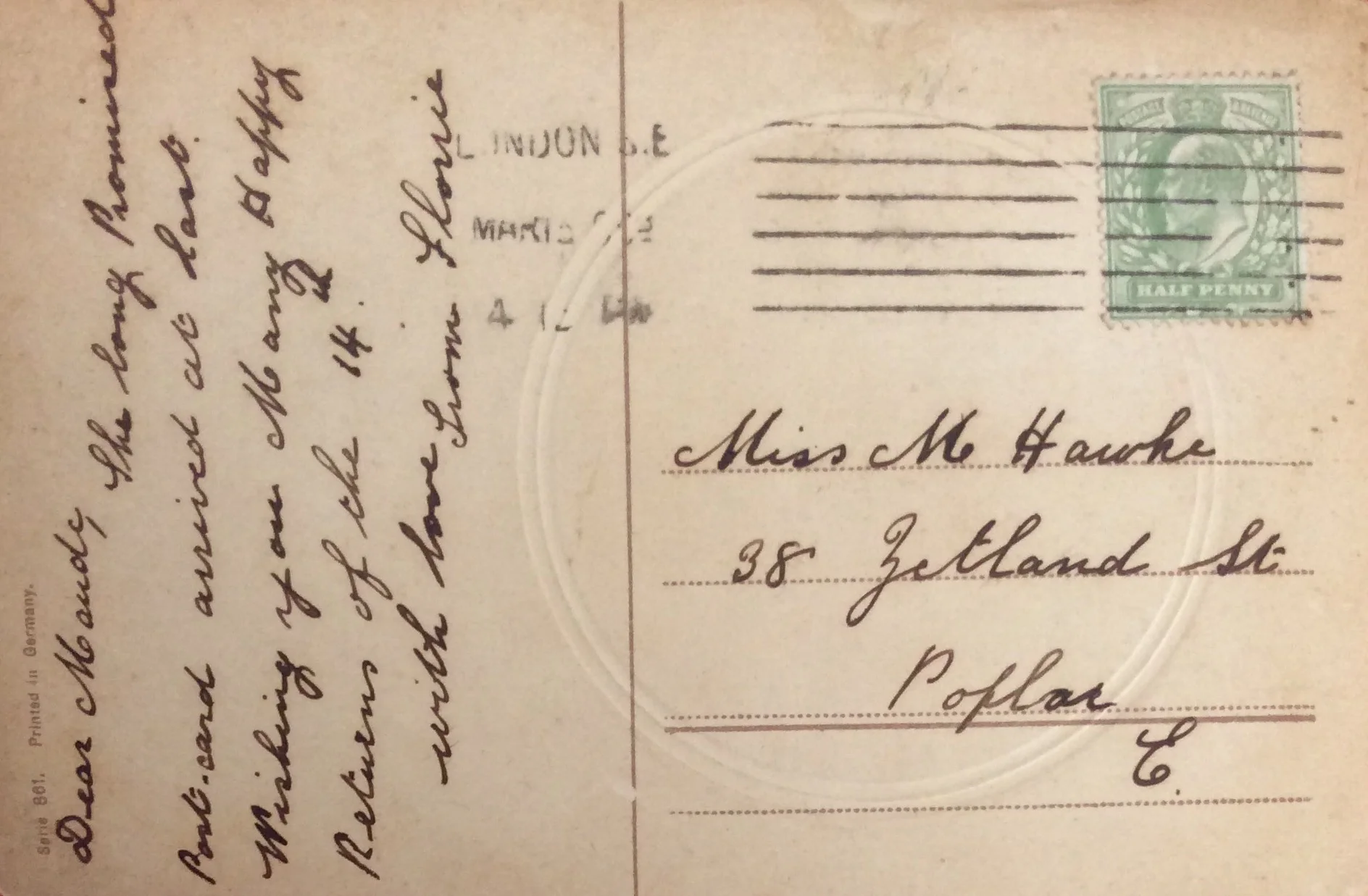 Emily Maude Hawke (1888-1977) was the sixth of eight children. Her parents were George Dowrick Hawke (1842-1917) and Eunice Sawson (1848-1920). In the 1911 census, George's profession is given as Seagoing Carpenter. Emily was a Tie Manufacturer Assistant. In this census she was using the name Maude rather than Emily.