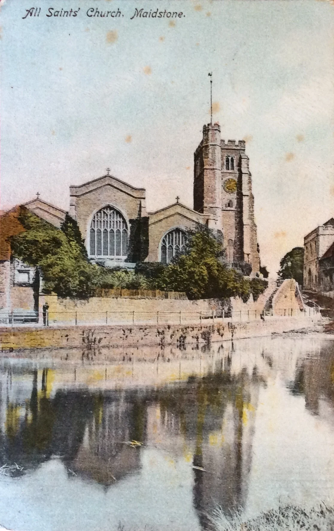 The picture shows All Saints Church in Maidstone which is Grade I listed today and local to where the card was posted and addressed (https://en.wikipedia.org/wiki/All_Saints_Church,_Maidstone)