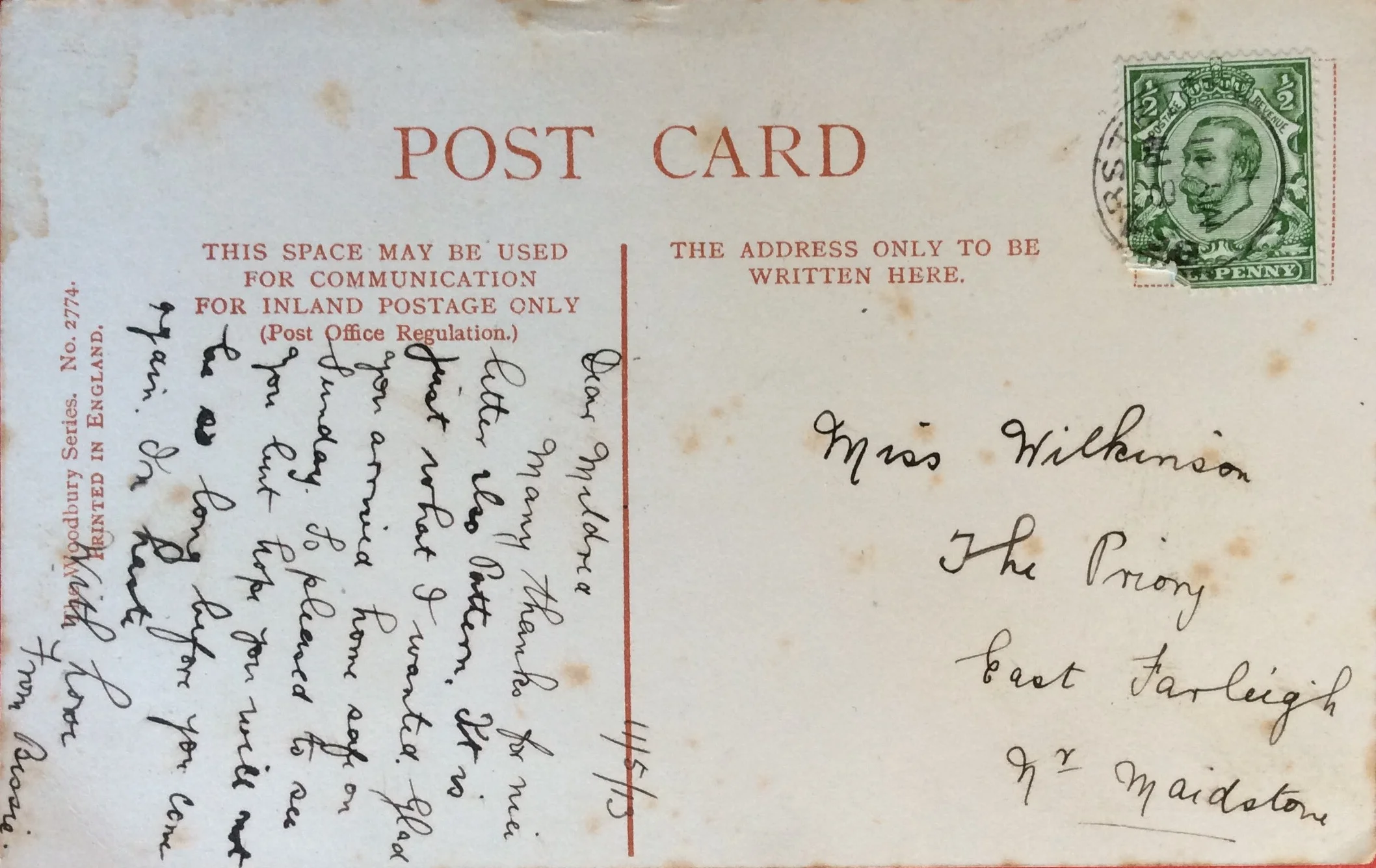 Mildred Wilkinson (1894-1986) was the second youngest of eight children. Her parents were Charles Oscar Wilkinson (1860-1945), a builder and Ellen Pettett (1860-1907). When this card was sent, Mildred was working as a servant for Beatrice Margaret Maconochie nee Ellis (1861-1936) the widow of a Royal Navy Captain Robert Bair Maconochie (1850-1897) in a 28 room property, "The Priory" which does not appear to exist today..