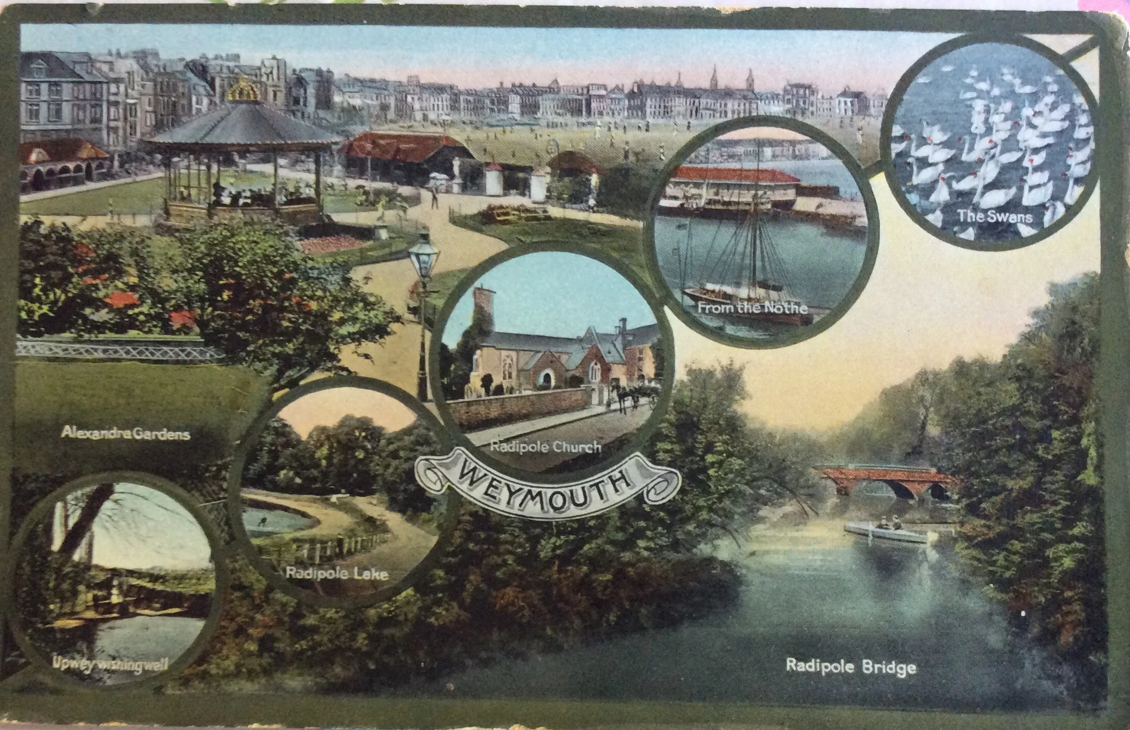 Weymouth was a tourist destination in 1913 and promoting itself with classic "wish you were here" style postcards with multiple views of local places of interest. Radipole Lake is now an RSPB reserve. Upwey Wishing Well now has a restaurant attached. Alexandra Gardens now seems to have an amusement arcade.