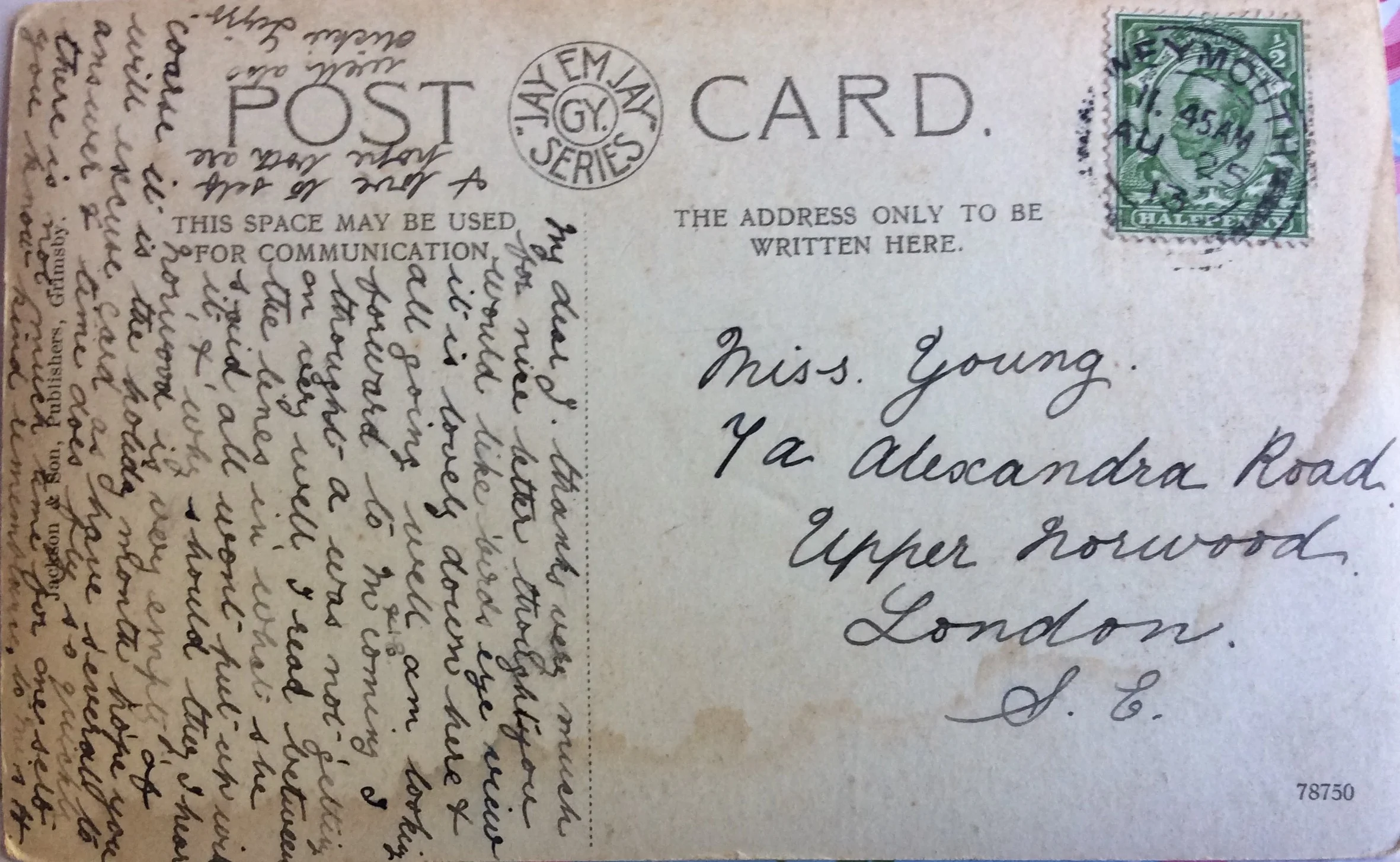 Even the name Lizzy is a bit of a guess. Whoever sent it wrote very small and did not bother with punctuation or capitalisation of letters and liked to refer to people by single letters rather than names. and there are some spelling issues. What relation they were to Miss Young is also impossible to determine. Family? Work colleague? Pupil to teacher? It can be assumed that whoever they were, they were on holiday in Weymouth from South London, or Surrey as it would have been in 1913. The somewhat gossipy element to the text makes them sound like a teenage girl, but who knows.