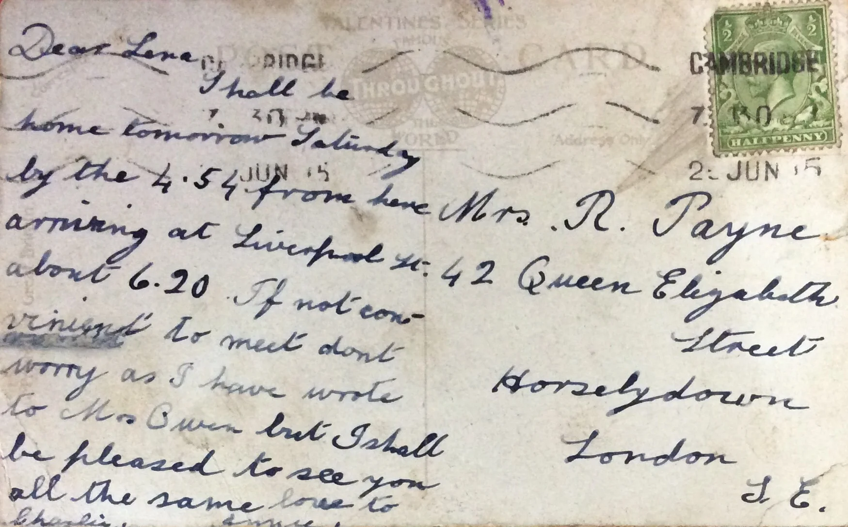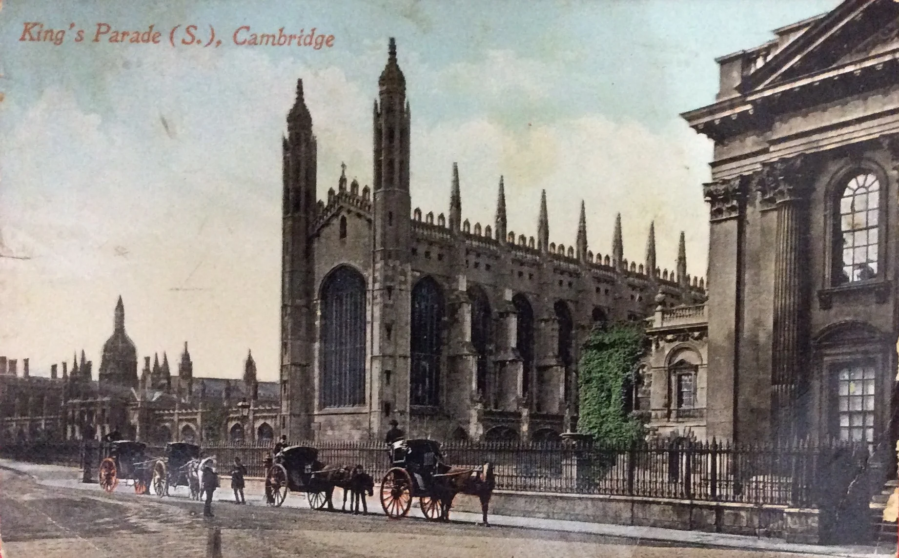 The picture shows King's Parade in Cambridge and that is where the card was posted. In 1915 it is highly unlikely that Annie Carter, three years married, was a student. The probable reason why Annie was in Cambridge was to visit family as that is where the Carter family originated.