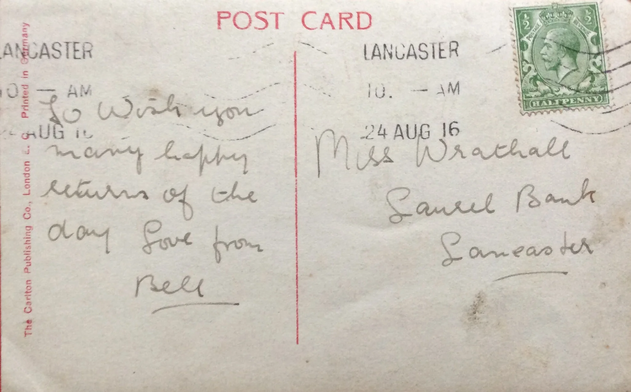 That is Isabell Wrathall (1903-1980). This is based on the signature of Bell, similarities in the handwriting, the style of the card, the location of Lancaster and the year of 1916.
