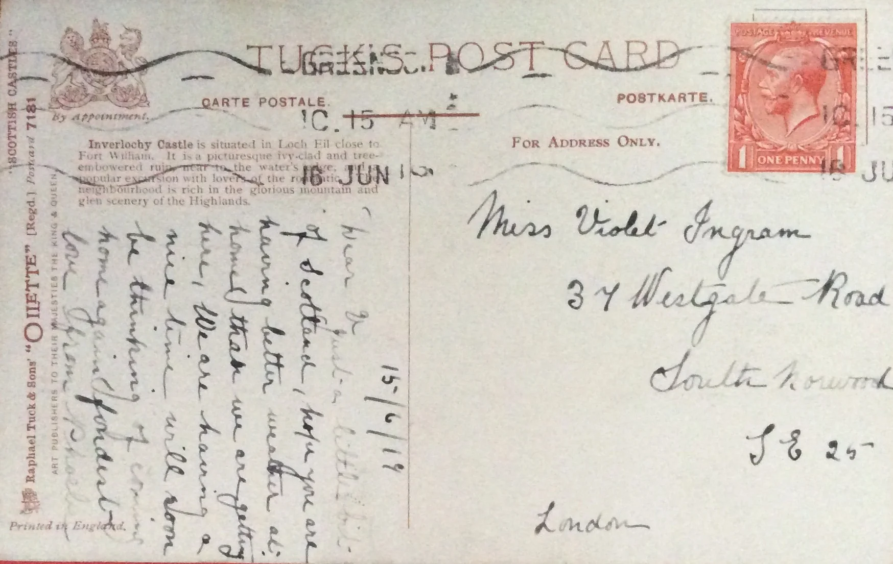 Violet Ruby Ingram (1897-1959) was the 3rd of 8 children. Her parents were Edwin George Ingram (1872-1964) and Anne Maud Mary Bulson (1872-1962). Edwin like several of his family was a carpenter by trade. Violet, her parents and her two elder siblings were all born in St Helier, Jersey. In 1939, aged 42, Violet was still living with her parents in Surrey near to where the card was sent to. Her occupation is given as "Gowns Hand" which is presumably something in the rag trade.