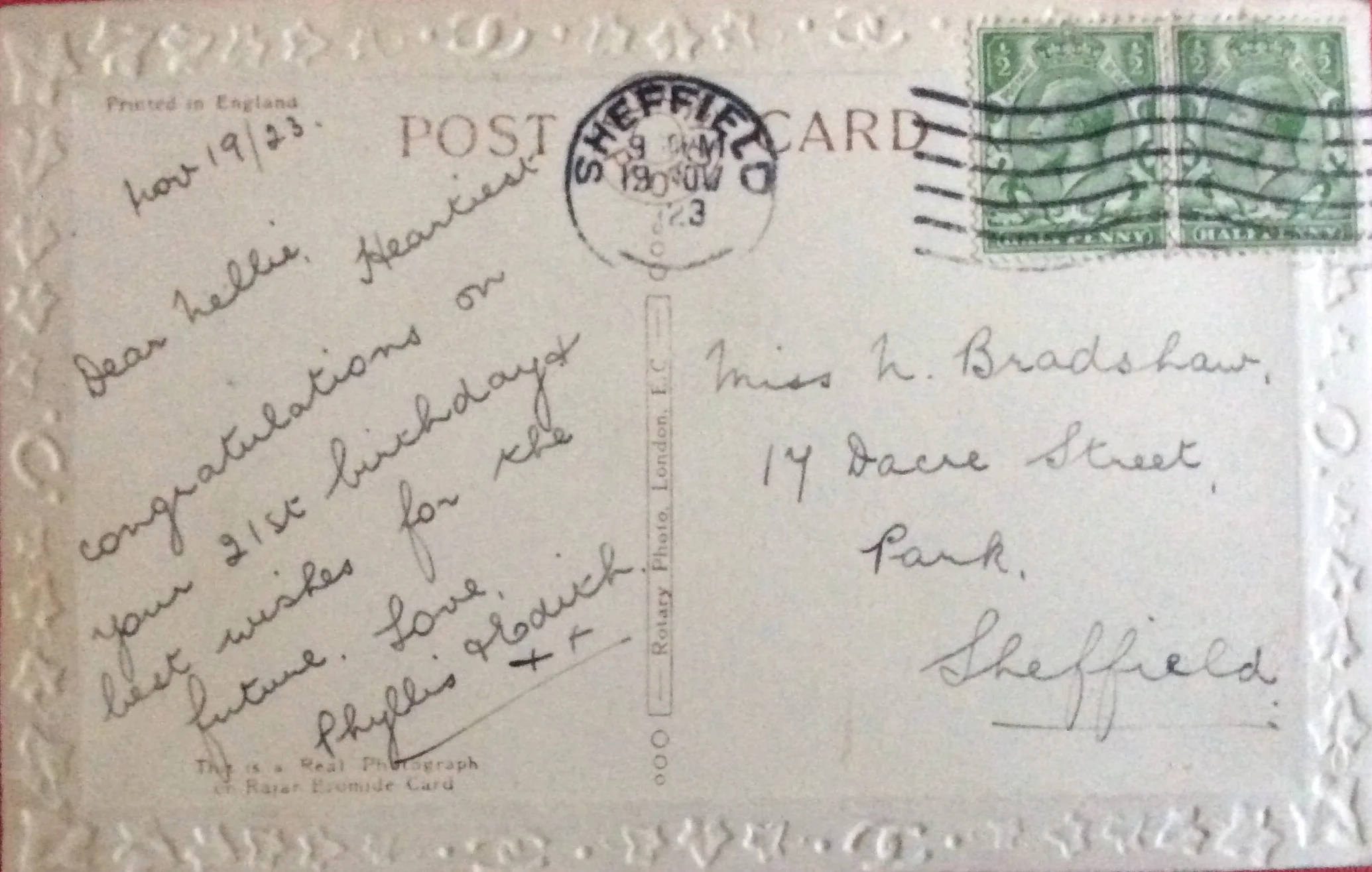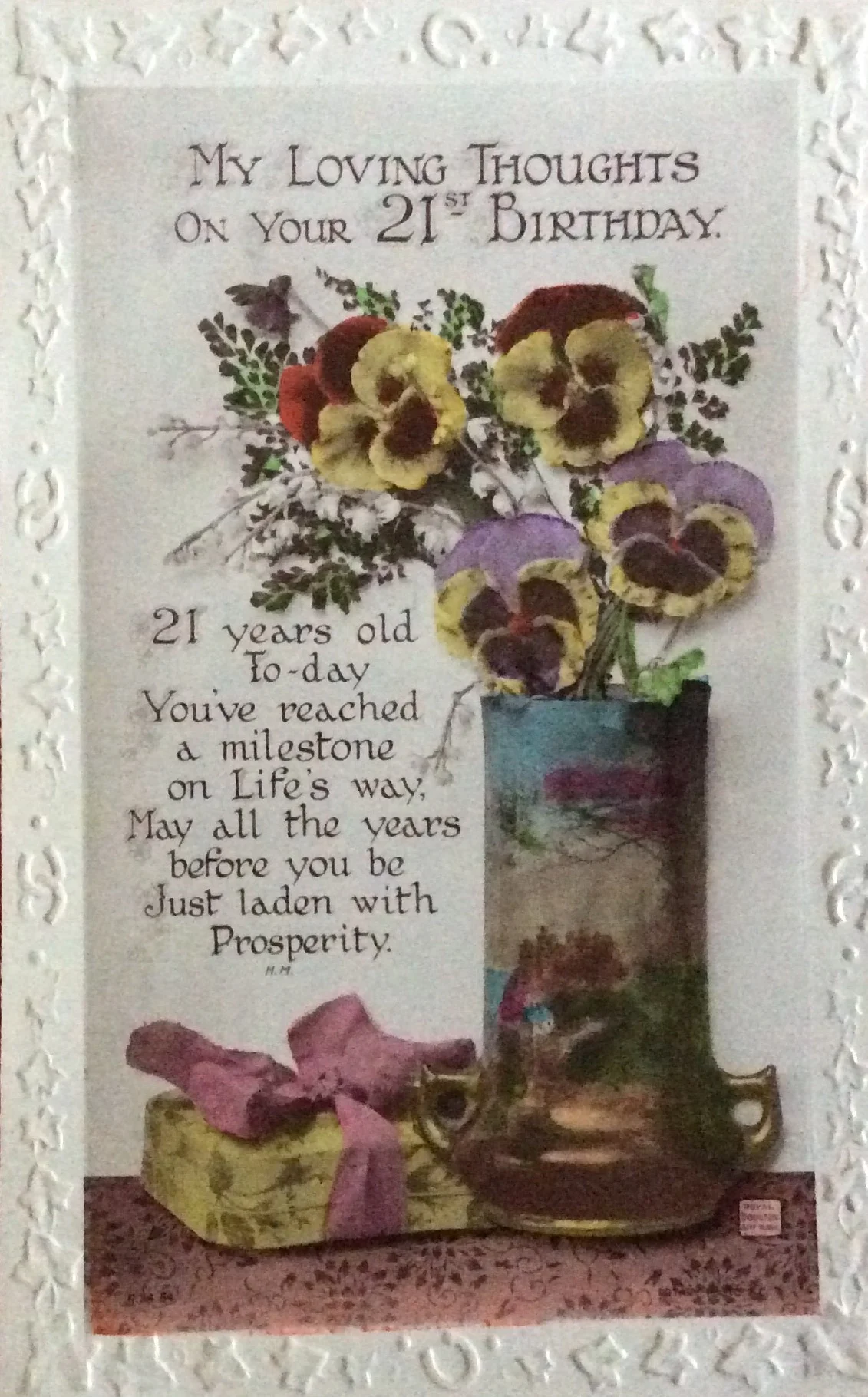 The card tells us that the Bradshaw girls continued to be sent and kept hideous birthday cards into the 1920s, the first example being in 1912. This one is made somehow worse for being a specifically designed 21st birthday card.