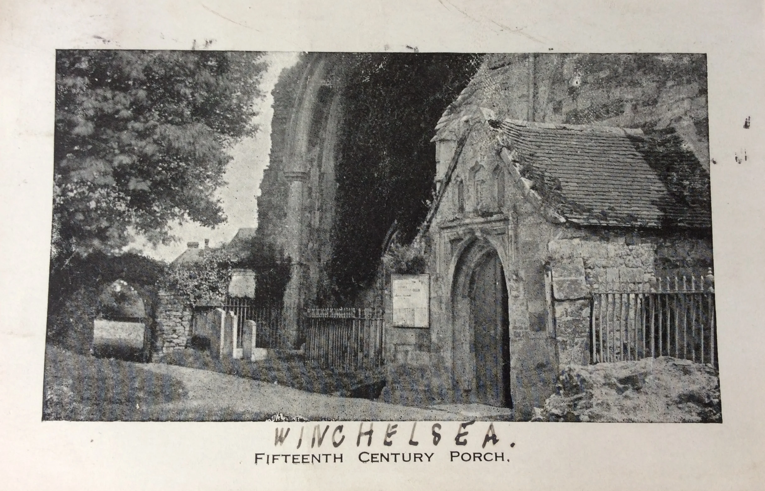 The picture shows the church at Winchelsea which is mentioned in the message. Just to be certain, the sender has written "WINCHELSEA" on the front.